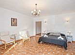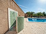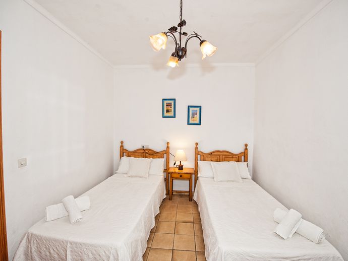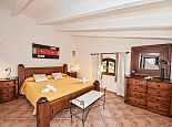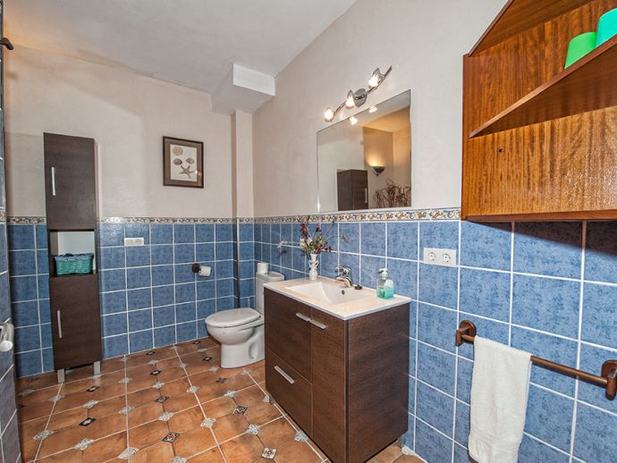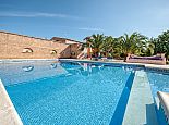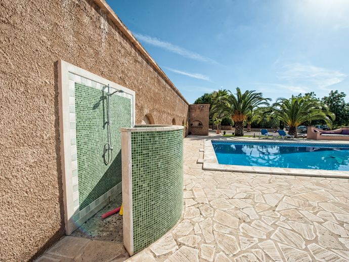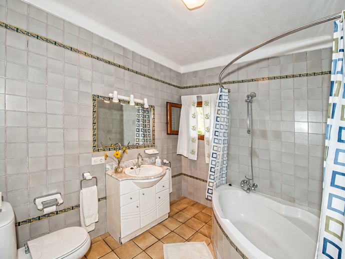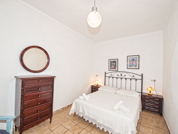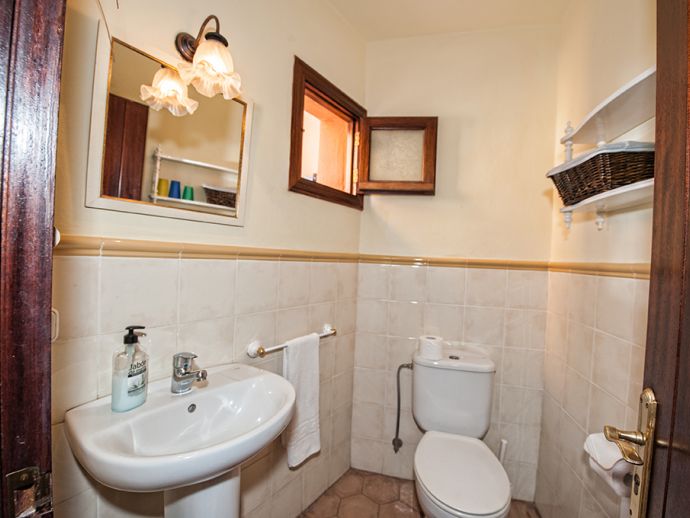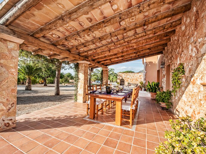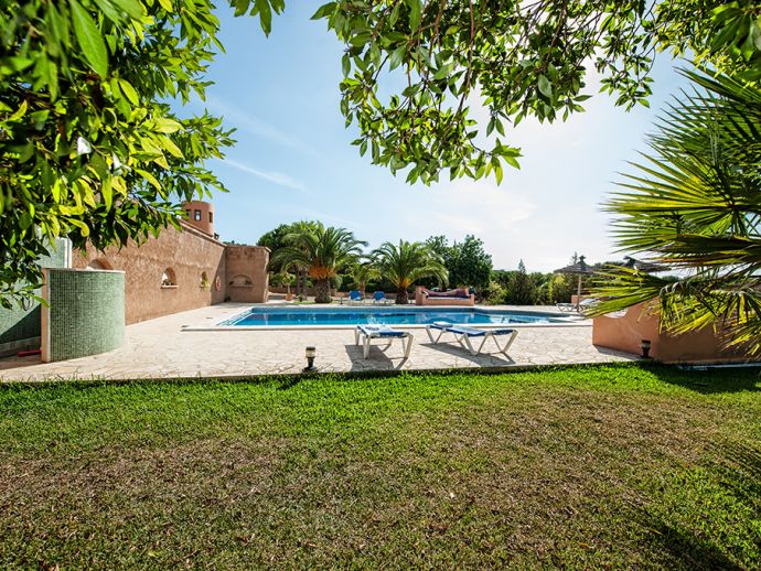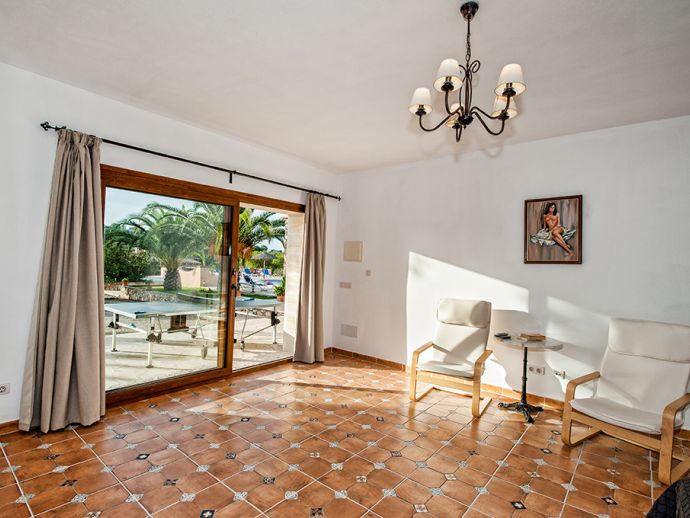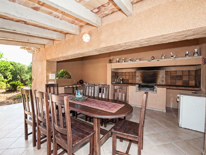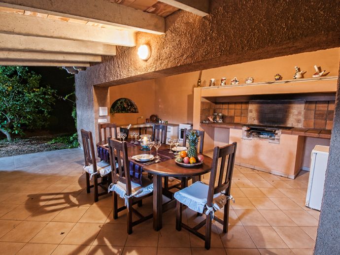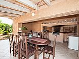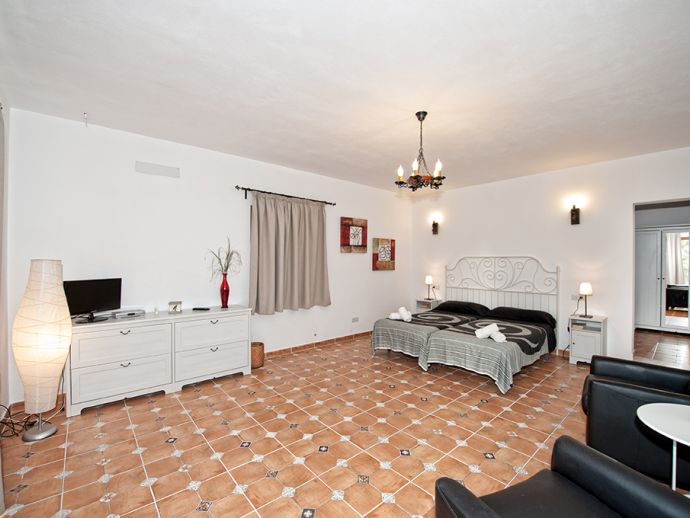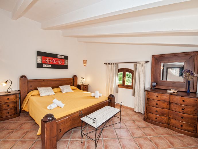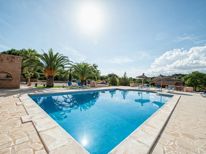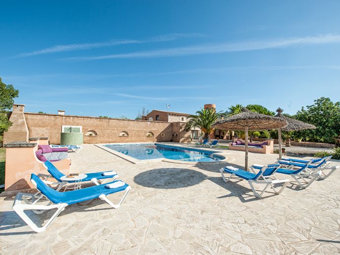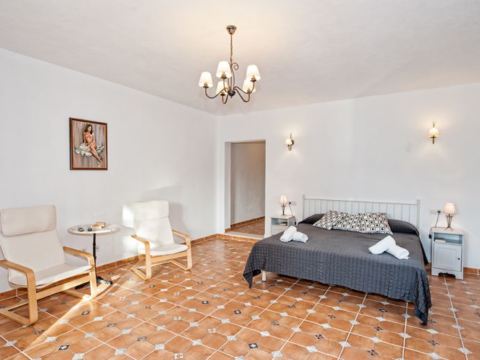 Finca Can Alegria is an attractive and spacious Mediterranean country finca with 6 bedrooms and 4 bathrooms. Four bedrooms are located in the main house. The other two bedrooms are extra large and located in the adjacent building, they feature big French sliding doors with direct access to the pool. Three of the bedrooms feature an en-suite bathroom. The main house has a living area with TV SAT and a fully equipped kitchen. Here is the first covered terrace, adorned with beautiful bougainvillia and with large table and chairs for meals in open air. The pool area features an extra large pool (14 x 7.5 meters), a barbecue house with another large table and chairs for grilled meals by the pool.