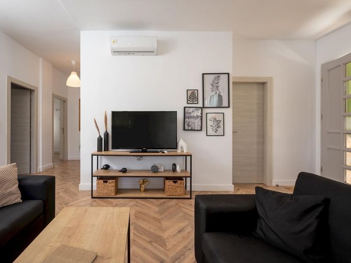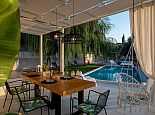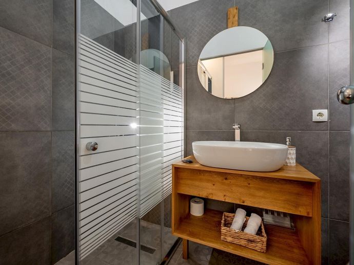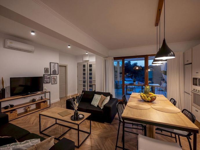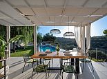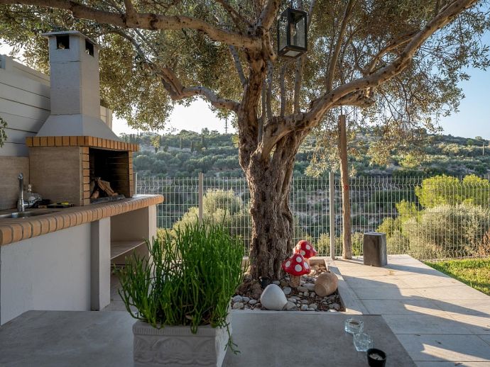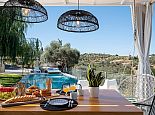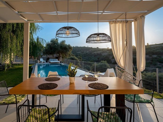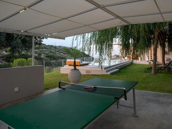 Callias Villa with a private pool is an impressive new villa that is set on the hillside in Kastellakia just a few minutes drive from the historic town of Rethymno. The property sleeps 8 guests in stylish and fully air conditioned interiors and offers stunning countryside and sea views. There are 4 bedrooms (2 doubles/2 twins) and 3 bathrooms (2 of which are en-suite) and an open plan living space with lounge, dining area and kitchen opening out to the garden and pool. The lounge is tastefully furnished with sofas, a 50" HDTV with standard cable/satellite and the kitchen is fully equipped with all appliances and kitchenware. The villa has amazing outdoor living areas designed for maximum relaxation and entertaining. There is an inviting private pool with a separated section for children (this can also be used for hydromassage), a poolside shower, sun loungers, a covered gym, table tennis, a purpose built barbecue area with lounge seating and a lovely dining terrace from where you can enjoy the stunning views. Callias Villa is ideal for families or friends seeking a memorable holiday in Crete!