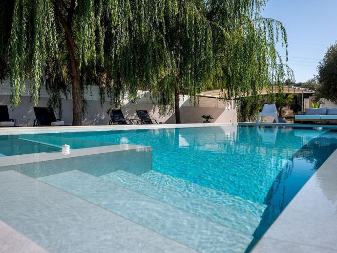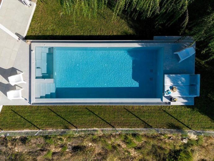 Private swimming pool (8.5 x 3.6 meters - depth 0.9 to 1.5 m) with step access and a separated shallow section for children or hydromassage.