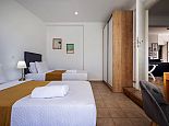 Bedroom: 2 single beds, A/C, doors to side patio/gym area