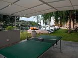 Brick-built barbecue with food preparation area, lounge seating and table tennis.