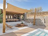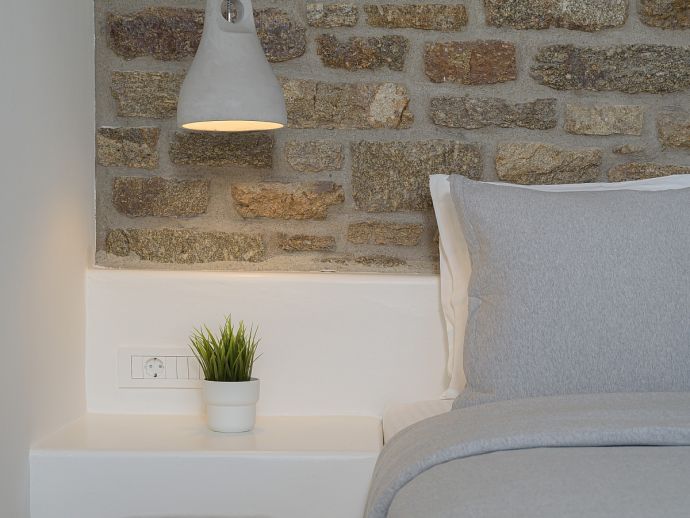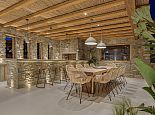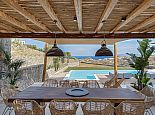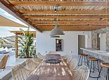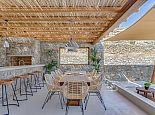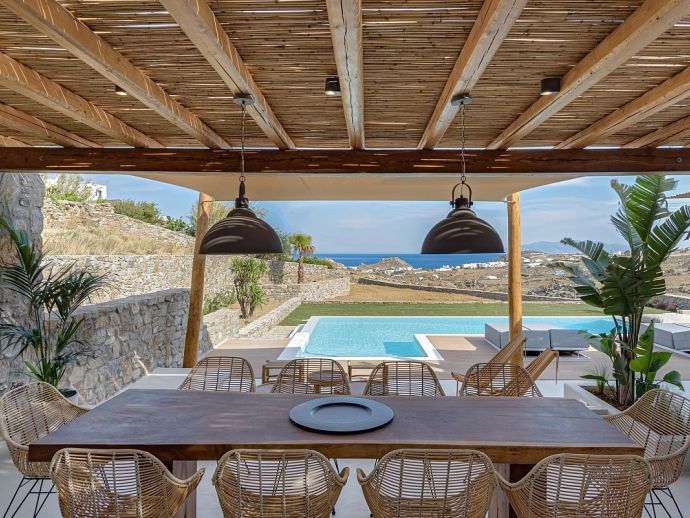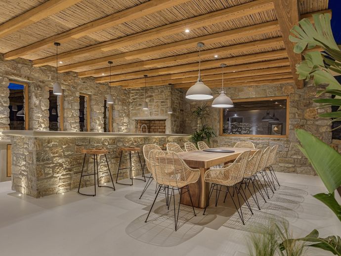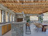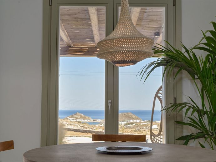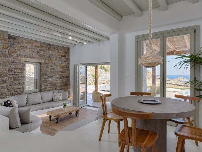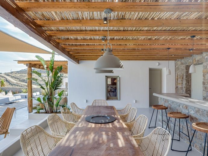 Villa Divounia with a private pool is an impressive 4 bedroom holiday home for up to 8 guests. Set on a hillside, just 800 meters from the sea it provides amazing views of the beautiful rocky landscape, the beach of Kalafatis and the fishing village of Agia Anna. The villa offers plenty of interior and exterior spaces which have been carefully crafted in every detail and luxuriously furnished according to the latest design. It comprises, 3 bedrooms with en-suite bathrooms and a separate cloakroom (w/c) in the main house with a 4th bedroom in a spacious guest house by the pool. The kitchen is fully equipped with high-end appliances and the living room features high-specification audio/video systems (Smart TV - Projector Home Cinema). Villa Divounia sits on an exclusive plot of 2 acres with a traditional garden of flowers, cacti, and ornamental plants and parking for up to 4 cars. The large private pool is surrounded by palm trees and feels connected to the endless blue of the sea whilst the outdoor dining room is a fabulous place to enjoy the magnificent views. It includes, a dining table seating 10, a stone bar with barbecue and built-in seating areas, ideal for relaxing and watching the colourful sunsets. The villa offers an excellent location 20 minutes from Mykonos town and 5/10 minutes from various beautiful beaches that combined with its high aesthetics and quality of construction make this property a perfect choice for a dreamy summer holiday on the island of Mykonos!