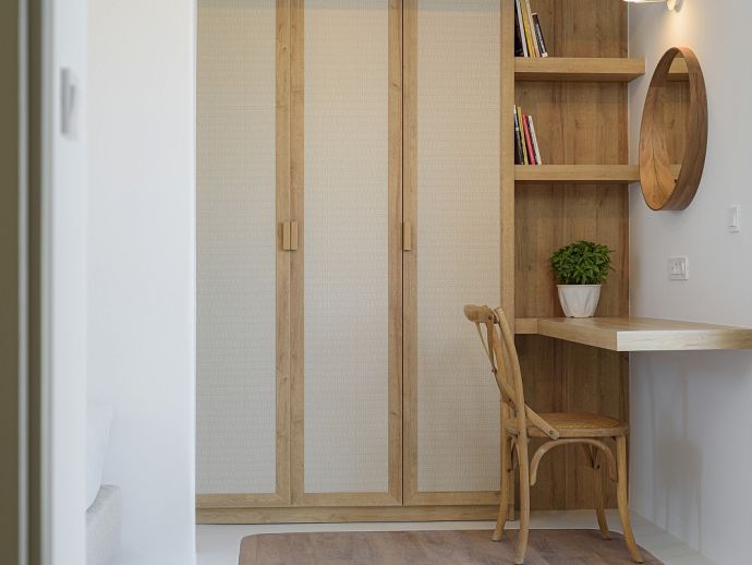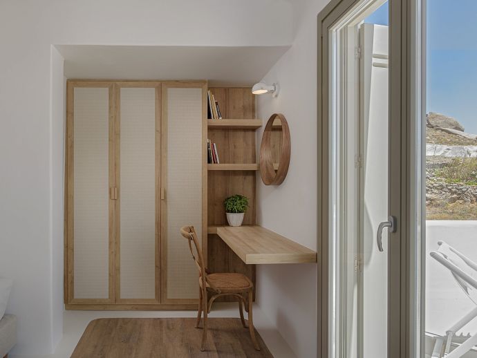Ideally situated on a hillside just 800 m from the sea with views of the beautiful rocky landscape, the beach of Kalafatis and the fishing village of Agia Anna, in Divounia. Mykonos Town and the airport can be reached within a 20 minute drive and the villa is just a few minutes from the picturesque village of Ano Mera with its unique monastery. In Ano Mera, you can find taverns, patisseries, as well as a pharmacy, and a supermarket for your supplies. The very beautiful beaches of Kalafatis and Agia Anna and other popular beaches including, Elia, Kalo Livadi, Lia, and Ftelia are 5/10 minutes by car.