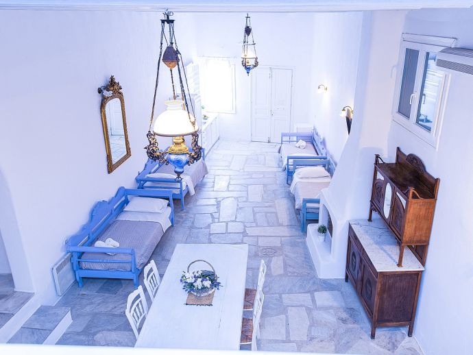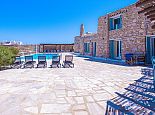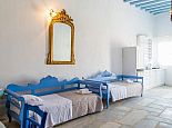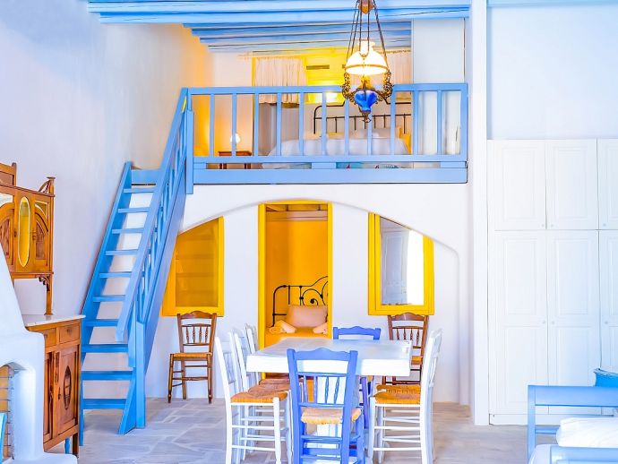 A maisonette that can accommodate up to 8 guests with 2 private entrances, one from ground level and one from pool level. Inside, there are 2 bedrooms with double beds (one is positioned above the other on a mezzanine floor and accessed via a staircase), a spacious living room with dining table and 4 single sofa beds, 2 bathrooms and a kitchenette area. The maisonette is traditionally styled and has air conditioning, a flat-screen TV and Wi-Fi. For your comfort, bed linen, towels, pool towels and bath toiletries are all provided.
