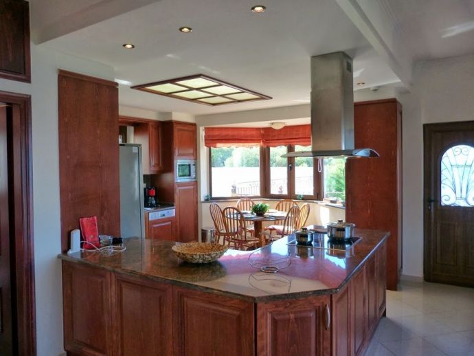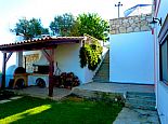Covered barbeque area, bread/pizza oven, seating area, table and chairs, salt water swimming pool (9,3x 5,75 m), with separate children section, private parking area, garden area, covered terrace, umbrellas, sun beds.