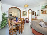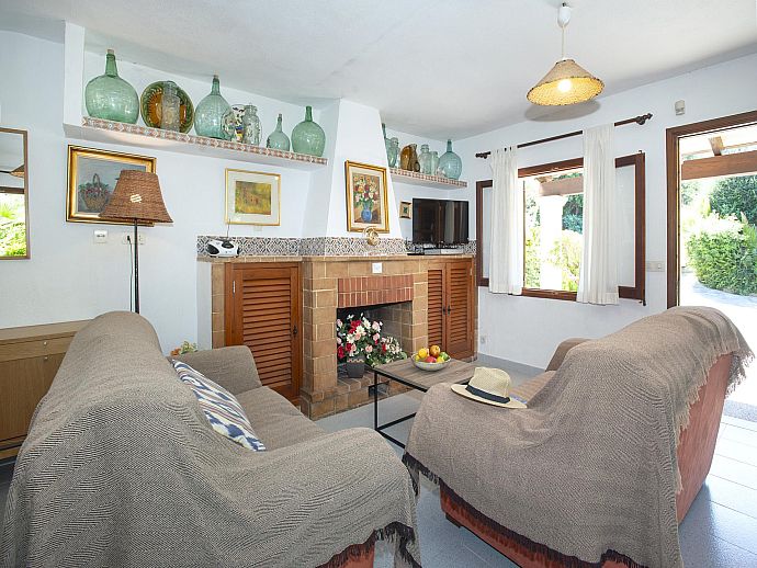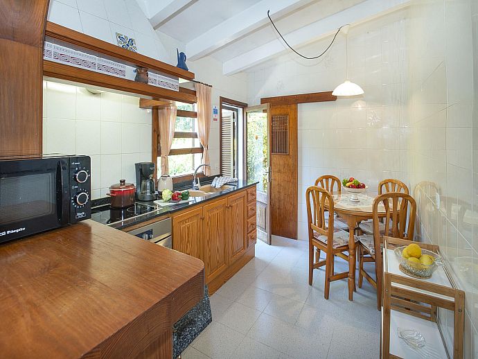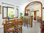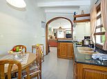 The interior reflects a traditional Pollenca home, with open plan living and dining area connected to a well-equipped kitchen, by way of an arch with small breakfast bar, with pantry and door to the outside terrace. A fine stone fireplace (for ornamental purposes only) commandeers the focal point in the living area with comfortable furnishings and windows strategically placed in order to shed natural light into the villa.