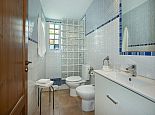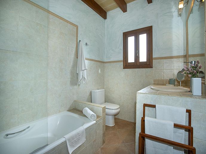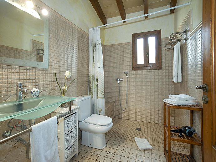 On the other side of the hall are three comfortable bedrooms - a double bedroom with en suite walk-in shower and two twin bedrooms located either side of a full bathroom all fitted with air-conditioning for sleeping with ease at night. Terracotta steps lead up to the fourth bedroom, which is an ample, lofty area with en suite bathroom incorporating both a bathtub and separate shower. Here patio doors provide direct access to a rooftop terrace with far reaching views over the surrounding geography and mountain range.