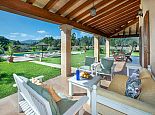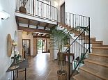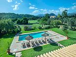 A grass track winds its way past a series of ancient gnarled olive trees up to the impressive, arched wooden door of Can Pallicer, as it stands majestically within spacious grounds dotted with lush Mediterranean shrubs, colourful indigenous plants, flourishing palms, clusters of gently swaying grasses and fringed by verdant hedging and olive trees.