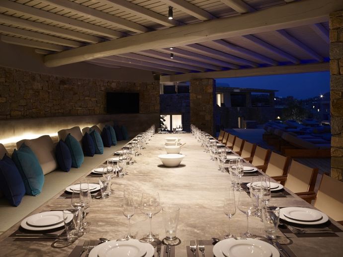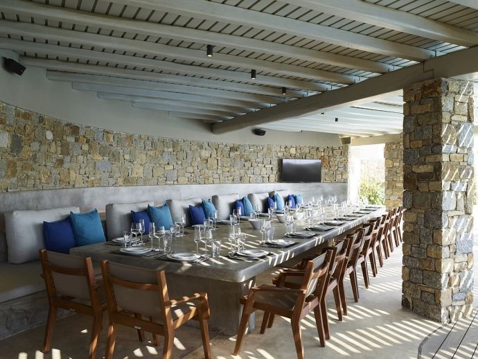 Blue Wave Villa is a modern 18 bedroom property with magnificent sea views, offering 3 infinity swimming pools, a gym, spa and grand shaded outdoor areas of over 400 m² suitable for dining and relaxation at any time. The villa comfortably accommodates up to 36 guests with 11 double en-suite bedrooms in the house of 700 m² plus 7 additional guest houses with individual entrances. The villa's interior is adorned with harmonious shades and elegant furnishings, creating a serene and sophisticated atmosphere with versatile living spaces for easy entertaining and uncomplicated holidays. All bedrooms feature 50" smart TV, Wi-Fi, hairdryer, safe box, ceiling fan and A/C, allowing each guest to enjoy their own personal space and comfort. There is also a large living room with 55’ Android TV, a dining room and a spacious playroom with corner sofa, 50’ smart TV, table football and a fully equipped kitchen. You will find a further 2 full kitchens in the outdoor areas, one at entrance level, ideal for breakfast preparation and dining on the sea-facing terrace with beautiful views and another by the pool, bar and barbecue with a shaded dining space for 40 guests. This property also features a 200m² gym with ample equipment, 2 x 55’ android TV, music system with internet radio and a spa area with a professional massage table, steam room, foot spa, cold barrel shower and Jacuzzi. Blue Wave Villa is conveniently located just a short drive to the idyllic beaches of Kalo Livadi, Agia Anna, Lia, Elia, Kalafatis, the picturesque village of Ano Mera and 20 minutes drive from Mykonos town. A perfect choice for for those seeking a luxurious and stylish getaway in a tranquil haven whilst having easy access the islands vibrant night life if required.