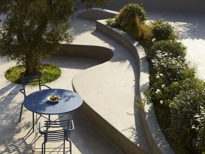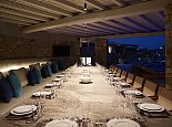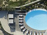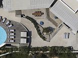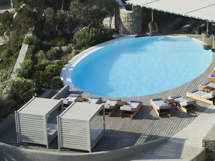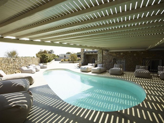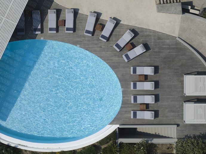 Plot Size: 3,000 m² with over 400 m² of outdoor shaded areas, amazing sea views • 1 x Infinity pool (25 m²) private to top upper level guesthouse • 2 x Infinity swimming pools (100 m² / 50 m²) with deck and amazing view to Kalafatis beach • 24 sunbeds and poufs • 3 double sunbeds • 1 large hammock • Corner pergola in front of swimming pool, the bar and the dining area and another pergola specially designed for quiet moments surrounded by olive trees • Grand shaded living space with dining area, sits 40 guests close to the barbecue area for romantic dinners or live evenings with music • Fully equipped external sound system • Barbeque equipped with wood oven • Bar fully equipped for unique evenings (drinks not included) • Independent fully equipped kitchen by the barbeque area with WC and shower room for personnel • WC and shower rooms for guests who are using swimming pool • Large outdoor space specially designed for children activities (bicycles, hoverboards) • 5 parking places at the top upper level and 3 parking places at the entrance level •