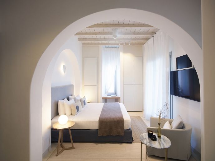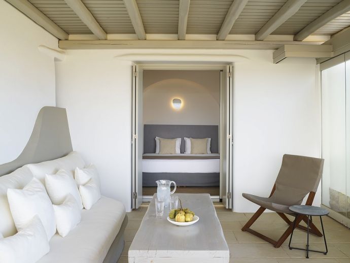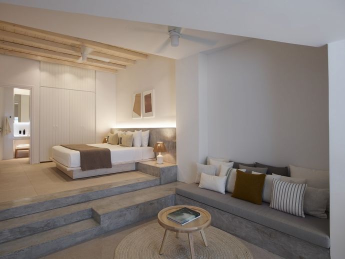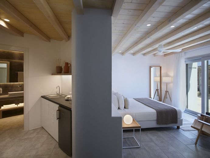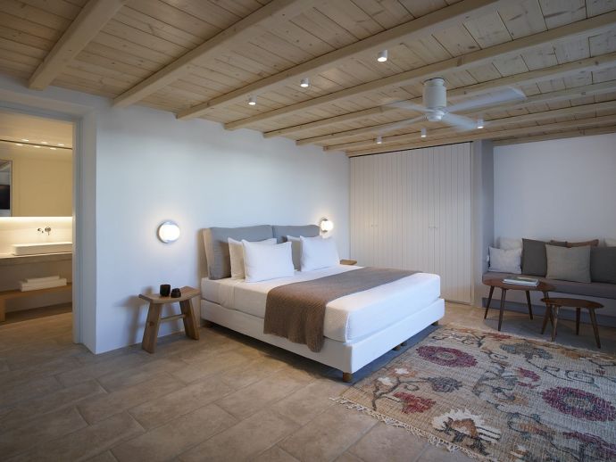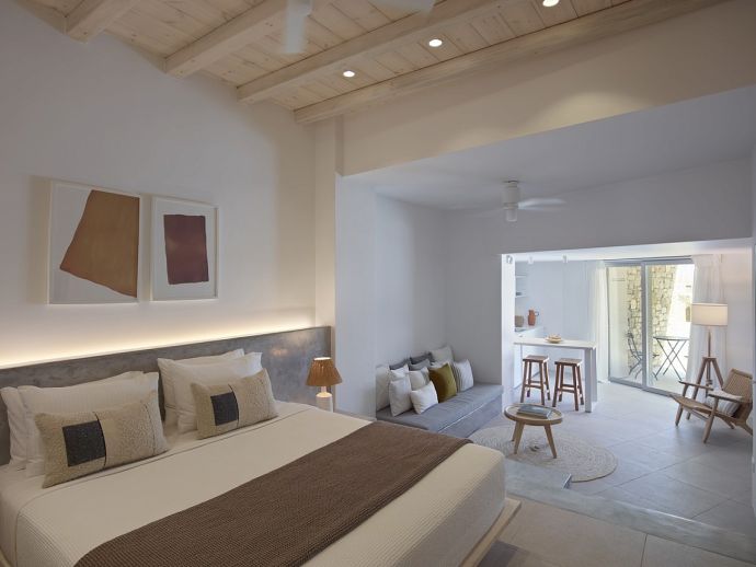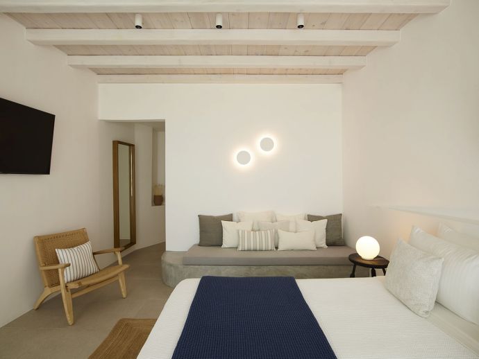 Equipped with 1 king size bed each, 50’ smart TV, ceiling fan, A/C, sofa, wardrobes, Wi-Fi, kitchenette, en-suite bathrooms (shower, w/c) and access through balcony and main doors to shaded outdoor areas with amazing sea views (one has access to a private infinity swimming pool).