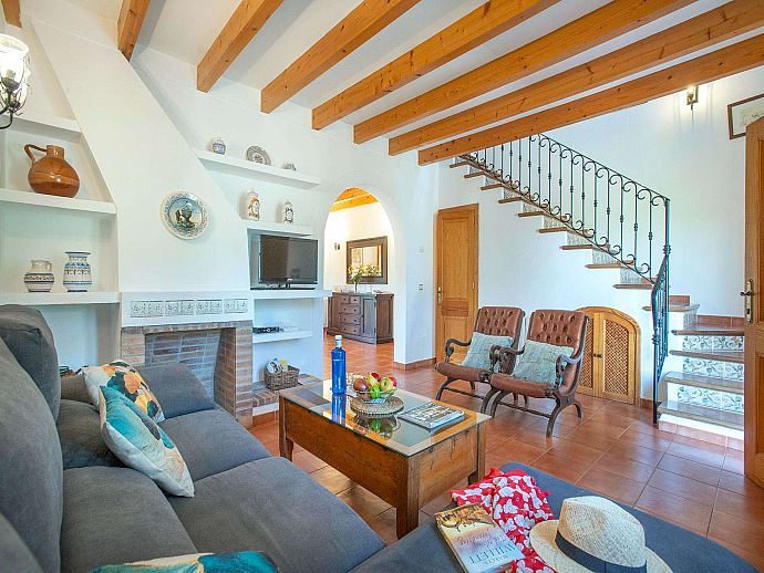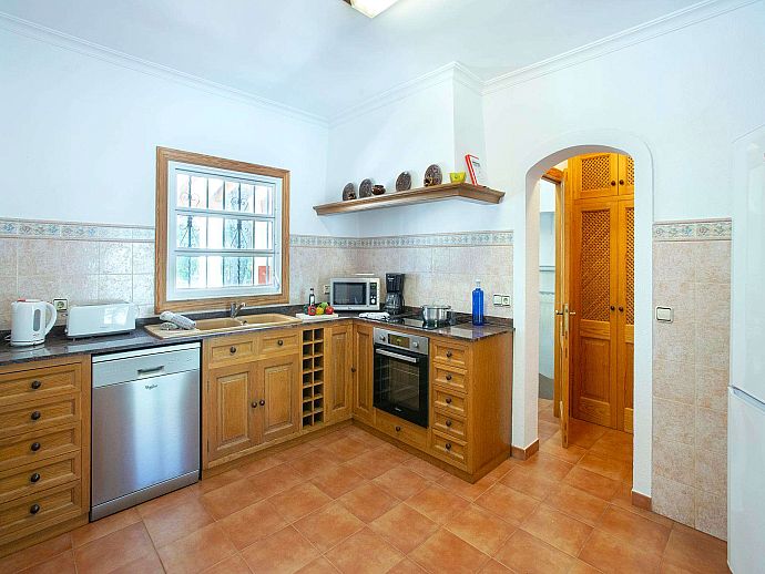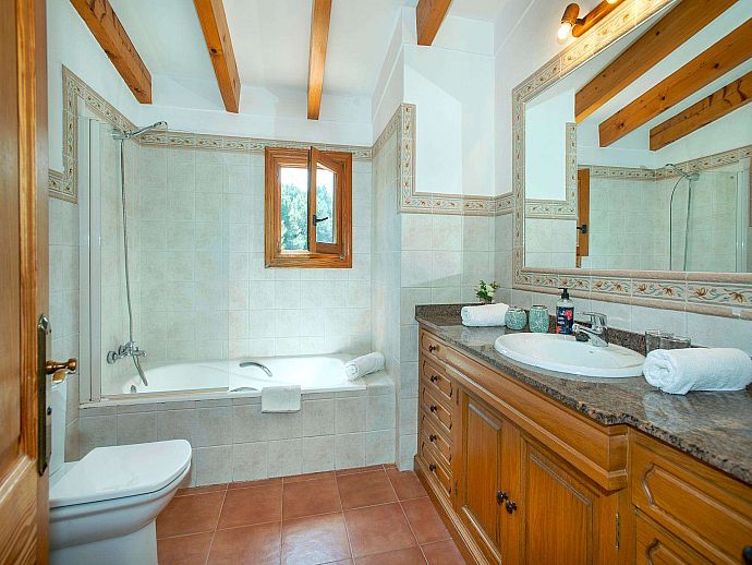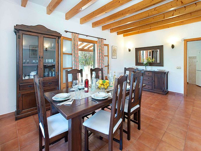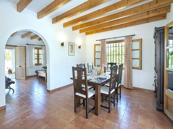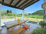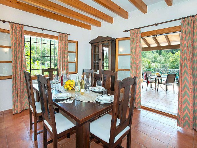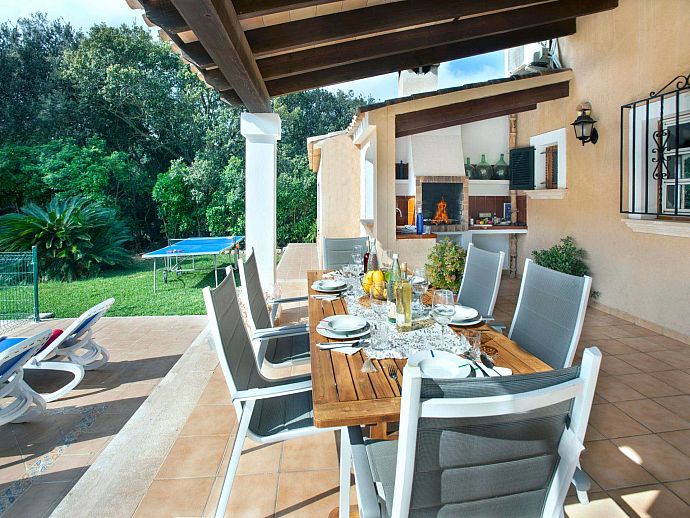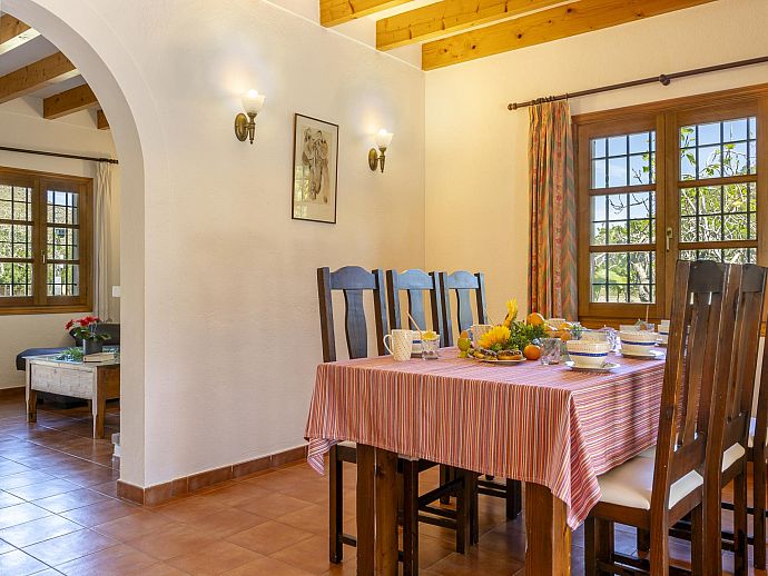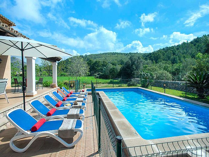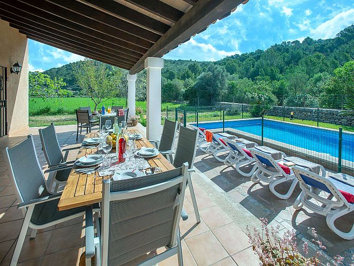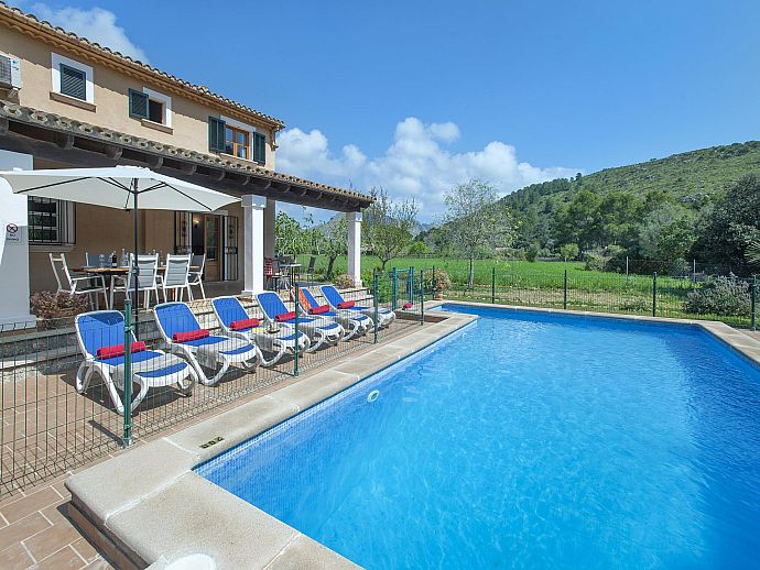 A covered front porch welcomes visitors in true Mallorcan style however, the real holiday activities take place on the other side of the property, with a spacious covered dining terrace incorporating a brick-built barbecue and additional seating overlooking the pool, sun terrace and an expanse of grass large enough to kick a ball around or encourage young feet to use up that surplus energy before bedtime. The surrounding area is notably peaceful and exceptionally picturesque with a backdrop of the Tramuntana mountain range, one of Mallorca's most renowned sights, skirting the edge of Pollença in the distance.