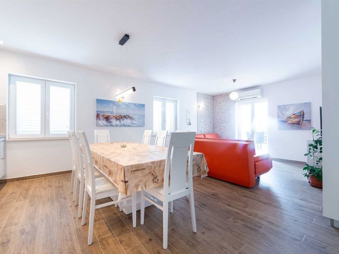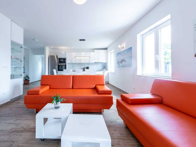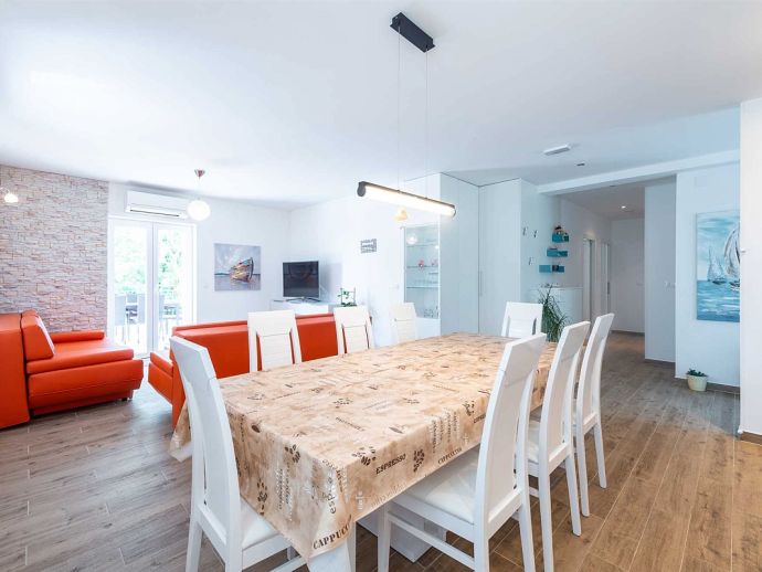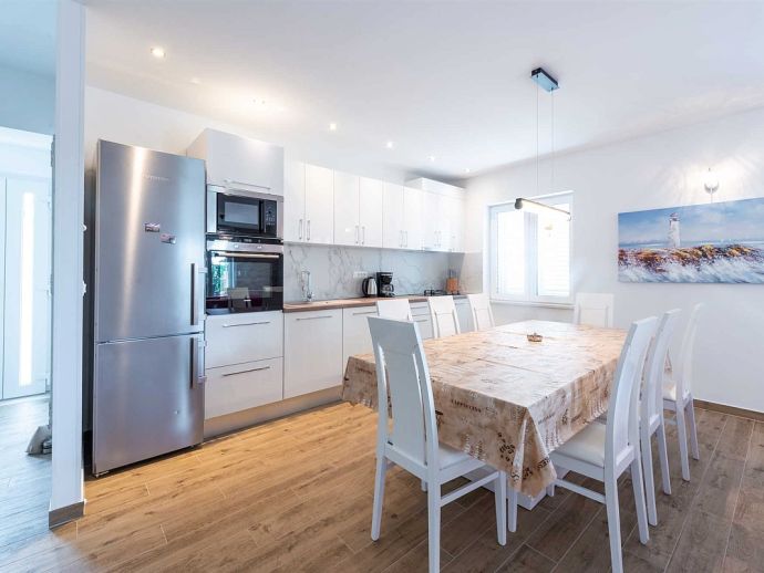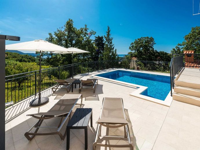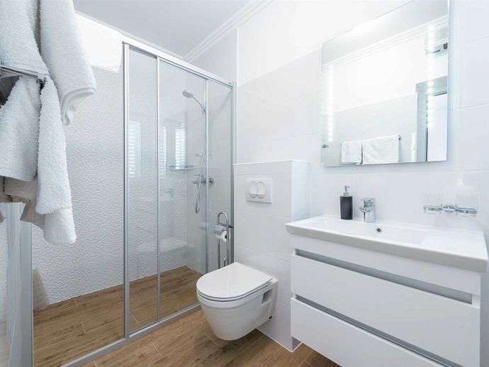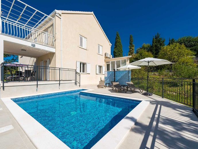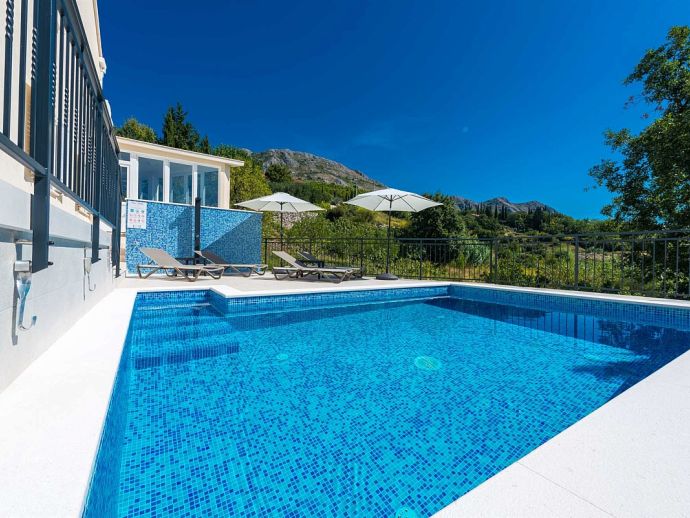 Villa Renata with a private pool is a newly built holiday home for 6 guests. It offers a peaceful location surrounded by nature, fabulous views of the coast and easy access to amenities and stunning beaches. Dubrovnik is 15 minutes by car or nearby, the village of Mlini is well connected with a regular bus and boat service giving you the opportunity to explore the ancient city and then escape the hustle and bustle back to a scenic retreat. The property is fully air-conditioned with modern furnishings and distributed over the ground floor. It comprises; an open plan living space with a fully equipped kitchen, dining and lounge area (leather sofas, SAT TV with Netflix), that opens to a covered outdoor dining area. There are 3 bedrooms with SAT TV's and en-suite bathrooms plus a guest cloakroom situated off the hallway. The outside spaces are all private and include a garden and barbecue area, parking (3 spaces) and a sun terrace equipped with loungers, umbrellas, poolside shower and an inviting swimming pool with Roman steps.