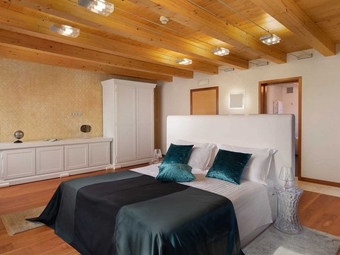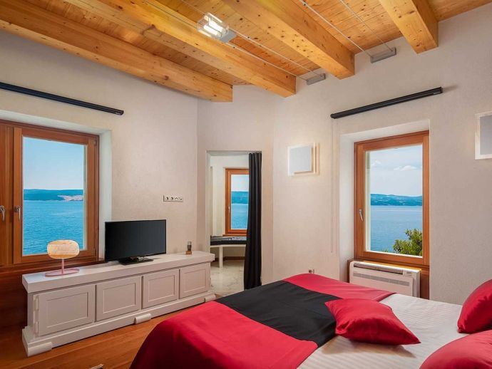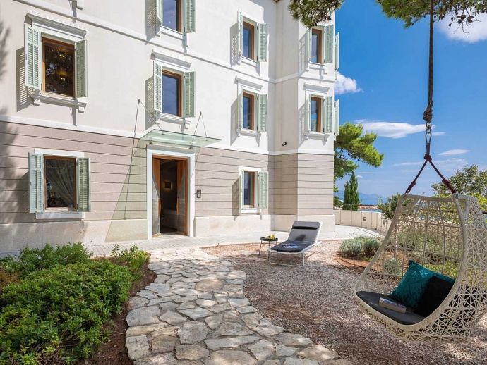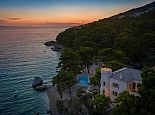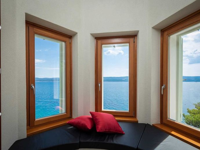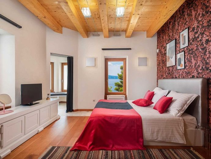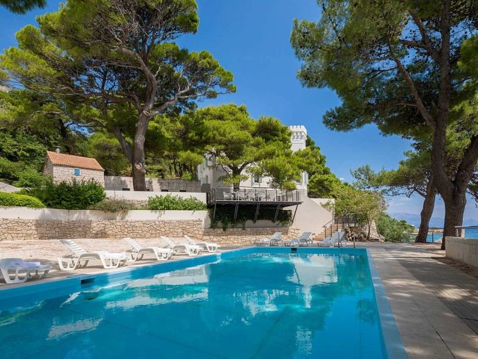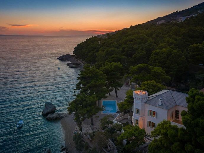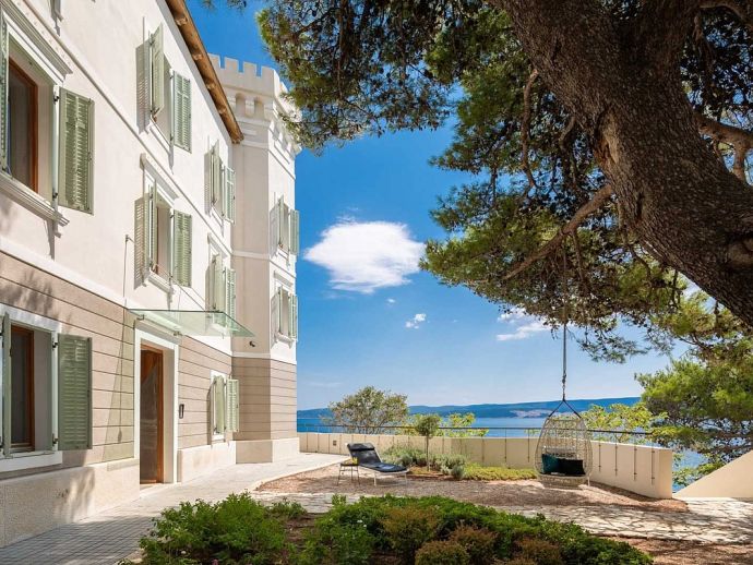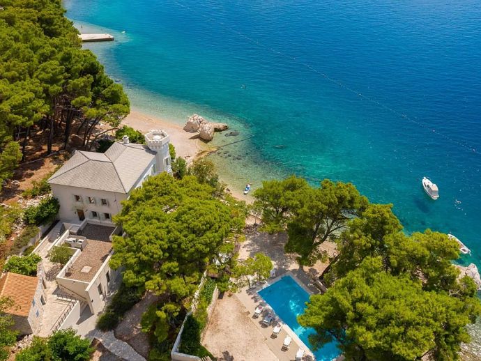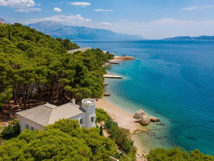 Castillo del Mar is an impressive seafront property for 8 guests, located along the Omis Riviera and just a few steps away from a pebble beach in the picturesque village of Lokva Rogoznica. This palatial villa offers an idyllic setting, mesmerising views of the Adriatic Sea, a private pool and an area dedicated to well-being, with indoor Jacuzzi/hot tub, sauna and fitness equipment. Originally built between 1910 and 1915 by the noble family, Dešković as a summer residence and renovated in 2009. The exterior has been completely restored in it's original form while the interior has been enhanced by additional amenities for a luxurious holiday. Distributed over 3 floors, the fully air conditioned interiors include 4 bedrooms, 5 bathrooms, recreational and living spaces of 330 m². On the ground floor, you will find a fully equipped 'professional' kitchen, a spacious living room with dining area, a guest bathroom and a well-being room with an additional shower, exercise using the fitness equipment, pamper yourself in the sauna or relax in the Jacuzzi with a glass of bubbles. A grand wooden staircase leads to the 4 bedrooms, 2 bedrooms with en-suite bathrooms on the second floor and 2 bedrooms that share a bathroom on the third floor. One bedroom on each level forms part of the authentic tower of the building with a small seating area and triple aspect windows providing panoramic sea views. The second floor also includes a home office and an outdoor terrace. In harmony with the natural landscape, the property is embraced by stunning pine trees on it's 600 m² plot with a garden full of Mediterranean plants and flowers. A large private pool with crystal clear water takes centre stage with sun loungers arranged around it, and a barbecue/grill house and dining area are ideal for al fresco meals. In addition, a decked area above the pool stretches out to create a floating terrace with stunning views. A perfect spot for a morning coffee and an evening spent watching the colours change as the sun sets over the sea.
