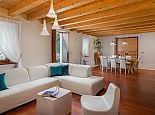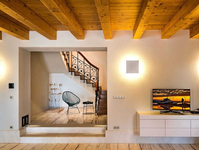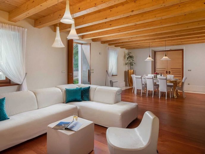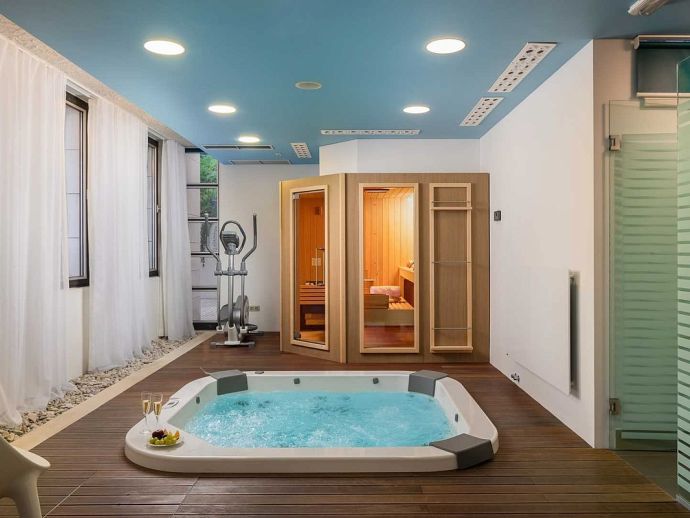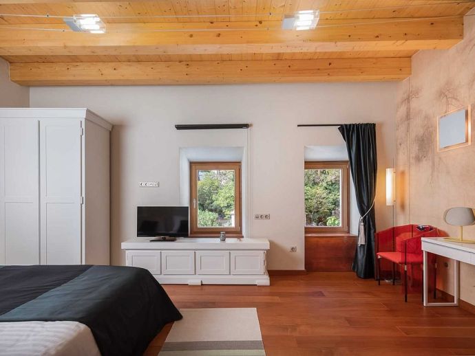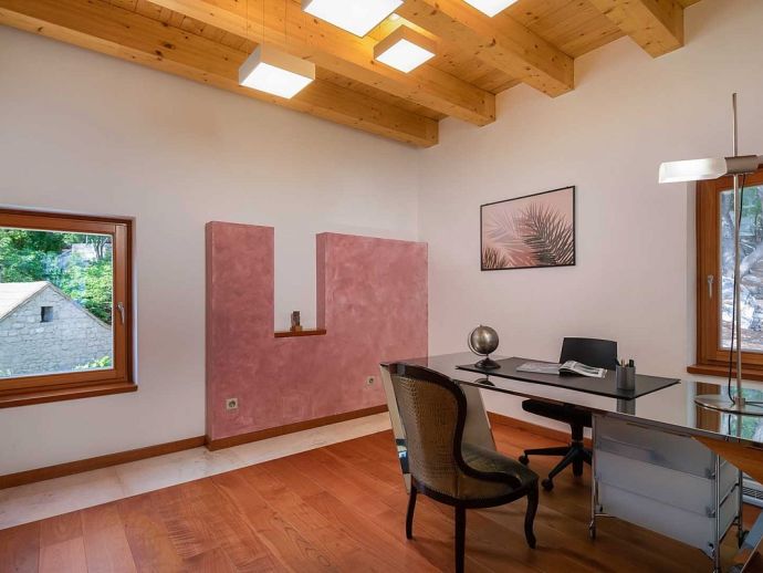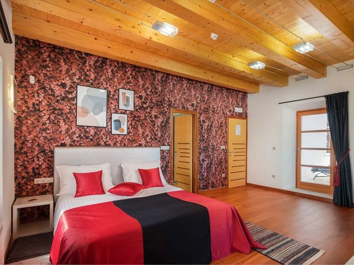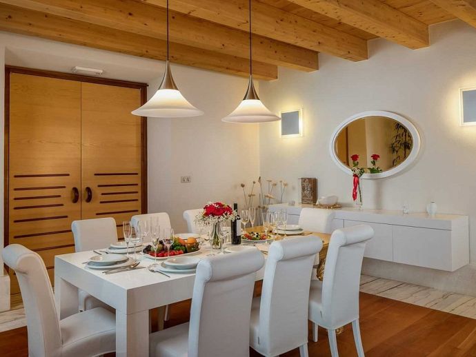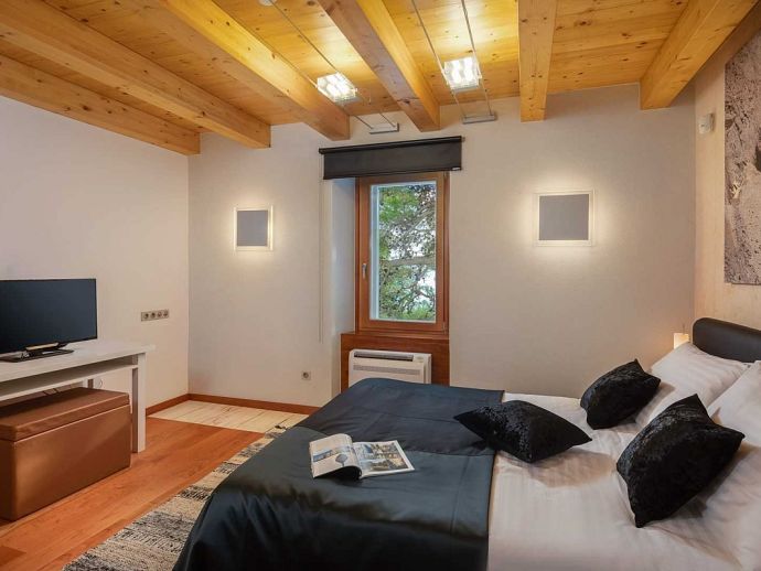 • Ground Floor • Living Room - A/C, comfortable sofas, LCD TV, fireplace, dining table for 8 people • Fully Equipped Professional Kitchen - A/C, cooking utensils, tea towels, stove, oven, hood, refrigerator, dishwasher, microwave, blender, Illy espresso capsule coffee machine • Guest Bathroom with shower • Wellness Area - A/C, indoor hot tub, finnish sauna, gym, additional bathroom with shower • Tavern - with traditional Dalmatian fireplace and sitting area (separate entrance) •