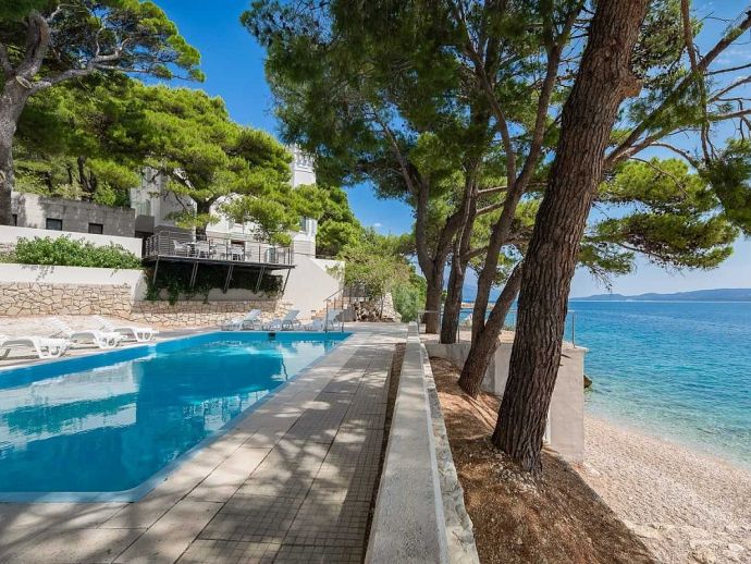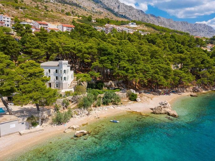 Castillo del Mar is situated on the beachfront in Lokva Rogoznica on the Omis Riviera, halfway between Split and Makarska and 7 km from the town of Omis. This charming place is now separated into two parts, the original village is set 260 meters above sea level with pine forests stretching all the way to the sea, connecting the mountain slopes of Omiška Dinara to the beauty of the coast. Lokva Rogoznica is an attractive destination known for its beautiful pebble beaches and outstanding clean and clear sea, thanks to the underwater currents that give it such a vivid blue colour. They are considered among the best in Croatia, with warm waters and plenty of natural shade making them