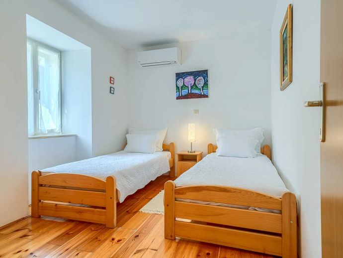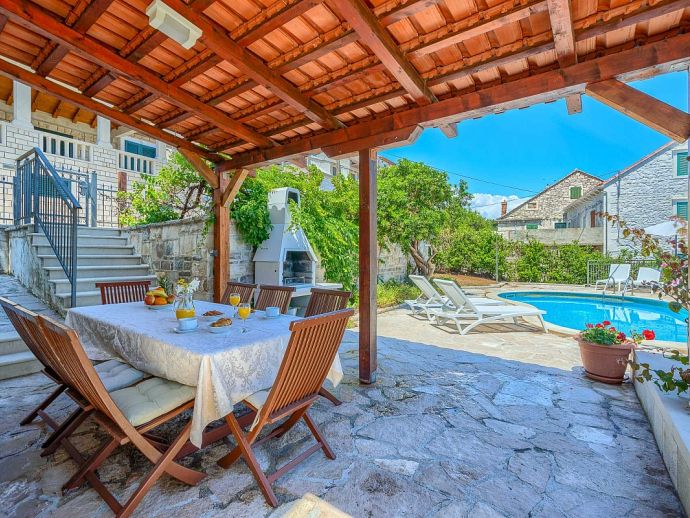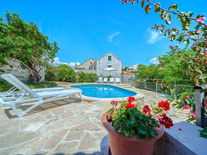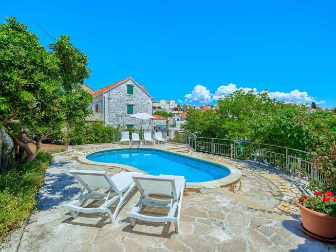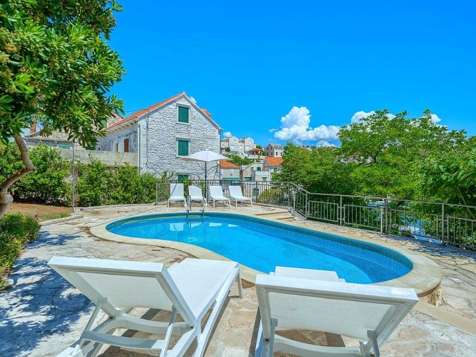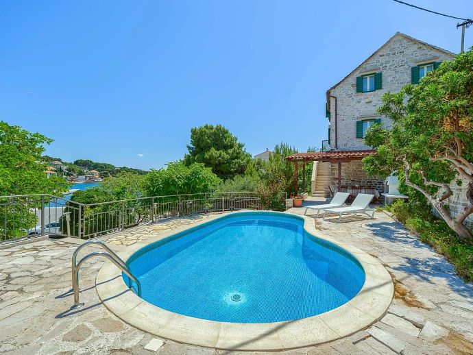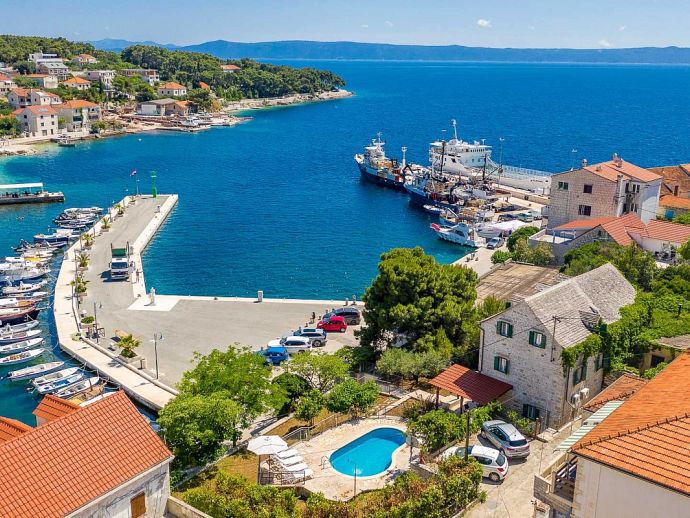 Villa Dariana with a private pool is situated in the centre of the pretty coastal town of Sumartin, on the beautiful Island of Brac. It offers superb views and a prime location just 20 meters from the seafront and a short stroll to beaches, cafes and restaurants. This traditional stone built property sleeps 6 in cosy yet modern interiors with air conditioning throughout its' three floors. It comprises; 3 bedrooms, 1 double with shower room on the second floor, and 1 double, 1 twin on the first floor with a shared guest bathroom (w/c). There is a further full bathroom on the ground floor along with a living area and open plan kitchen. The house is fully equipped with all kitchen appliances, SAT TV and Wi-Fi. Outside, the landscaped garden is fenced and includes a private pool, sun terrace, loungers, al fresco dining area and a built-in barbecue. A path from the garden leads directly down to the port where you can buy seafood directly from the friendly fishermen who arrive daily with their catch.