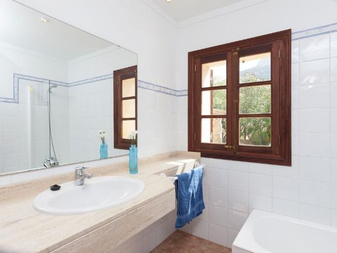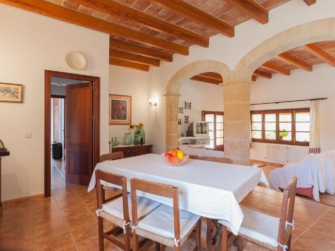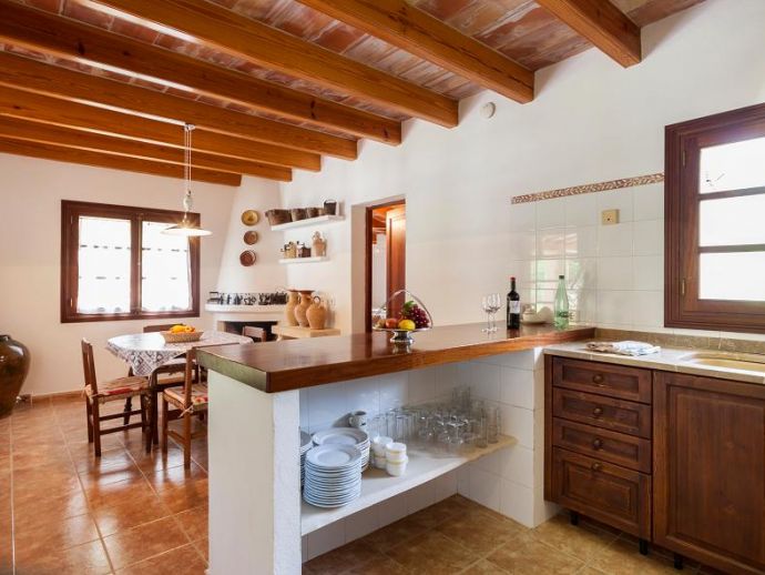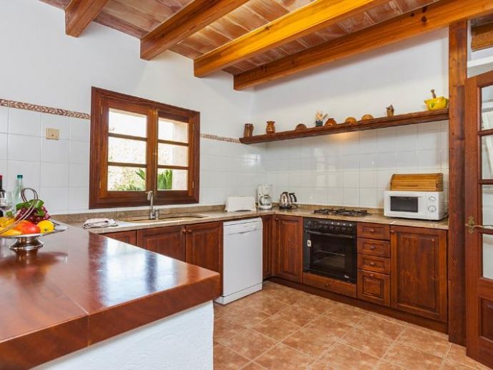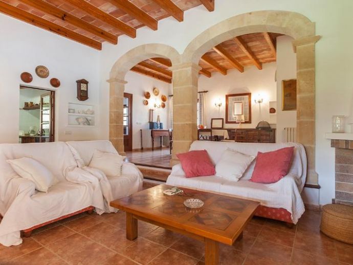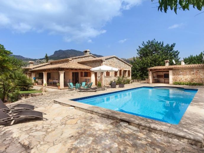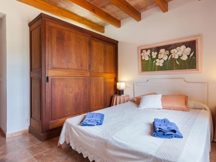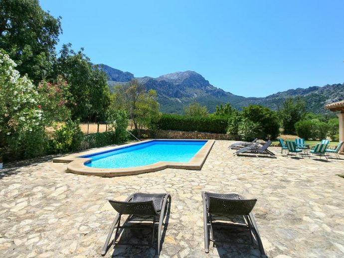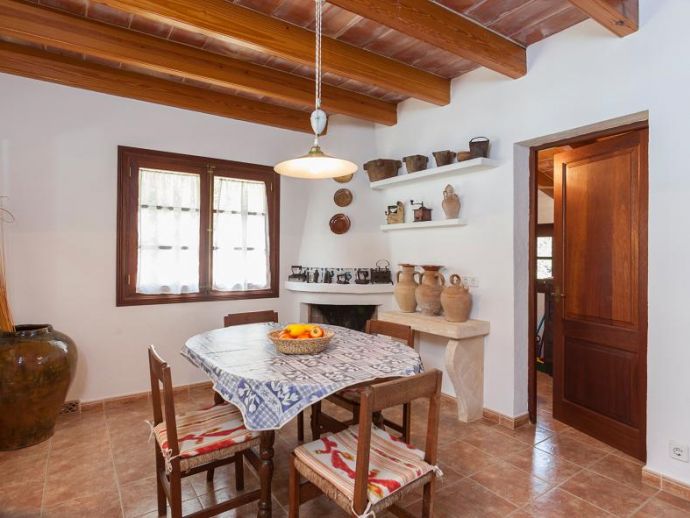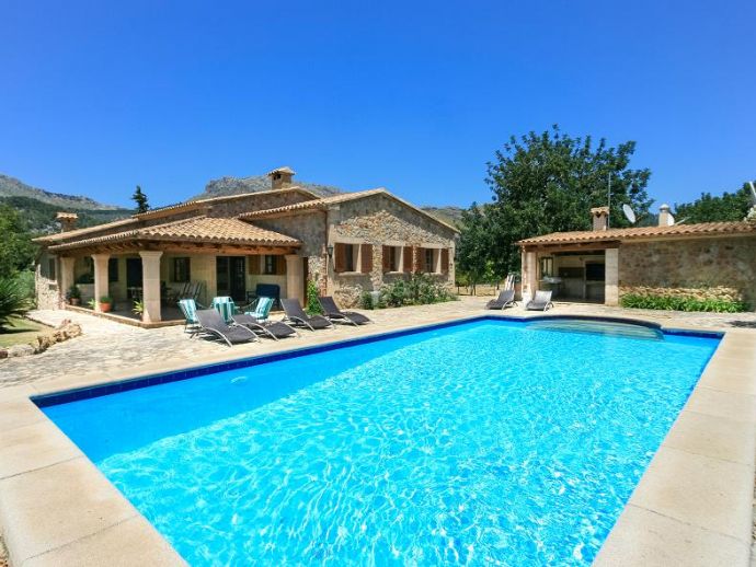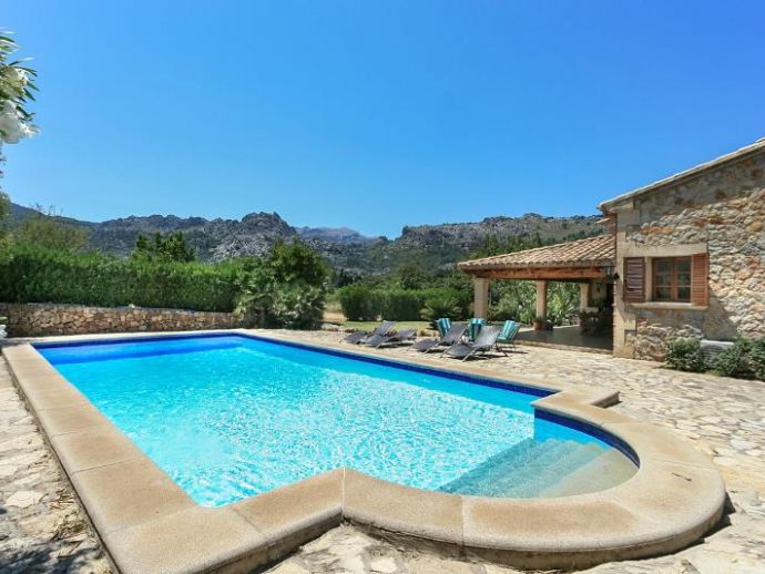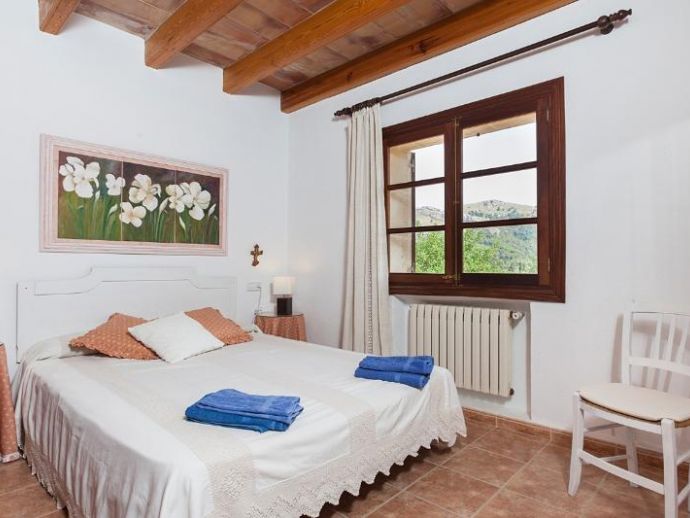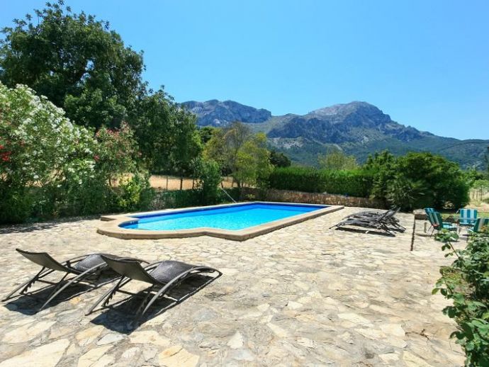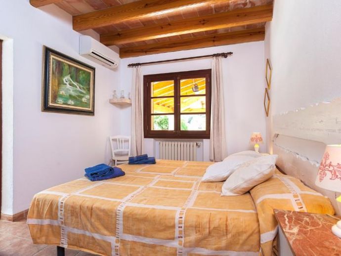 Casa Es Jardi is a cosy and spacious holiday home, located just below the impressive Tramuntana mountain range in Pollensa, furnished in a traditional style with wooden beams and terracotta floors throughout. It has three bedrooms, all with the air conditioning on a timer and two bathrooms accommodating six people. It has views to the mountains and the private swimming pool. The house is situated in a quiet neighbourhood in a beautiful rural area. The kitchen is fully equipped and the living area features satellite (languages: Spanish, English, German) and stereo.
