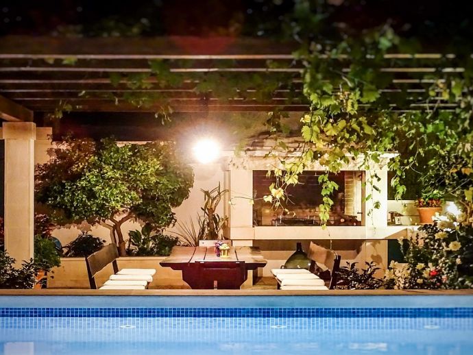 Enclosed terrace with private pool (32m²), chill out furniture, stone built barbecue and pergola with dining furniture.