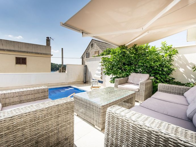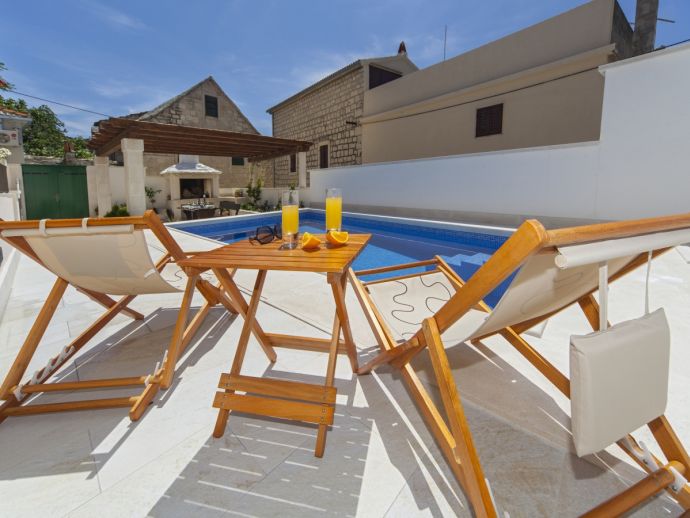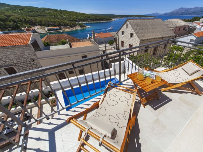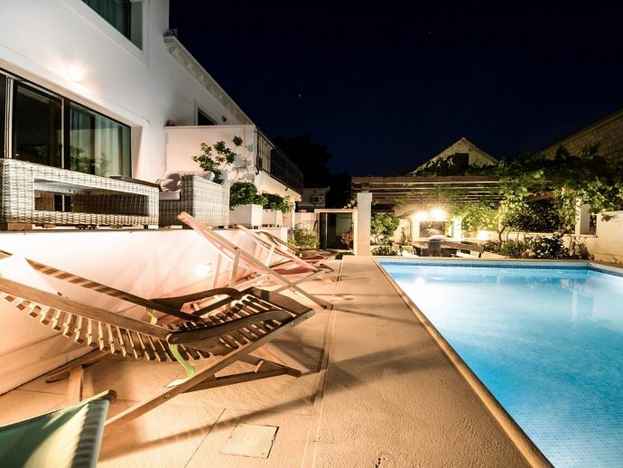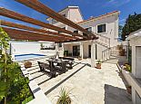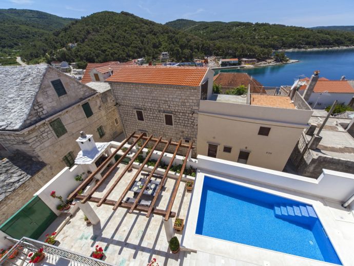 Villa Janus is situated in the centre of the village of Povlja on Brac, near an early christian basilica. It is a traditional Dalmatian 3-storey stone house and has been renovated and furnished to a high standard. It offers sea views from the balcony and terraces and is just 200 meters from the beach. The villa has air conditioning, WiFi and accommodates 10 people in 5 bedrooms with en-suite bathrooms. All areas of the villa are spacious and light with an open plan fully equipped kitchen/dining area and a comfortable living area with glass doors and views to the pool. The main terrace/pool area has potted plants in vibrant colours and enhances the beauty of the natural stone. There is a pergola with dining furniture, a large stone built barbecue, sun chairs and modern chill out furniture. This villa is ideal for families or groups seeking a relaxing holiday in beautiful location.
