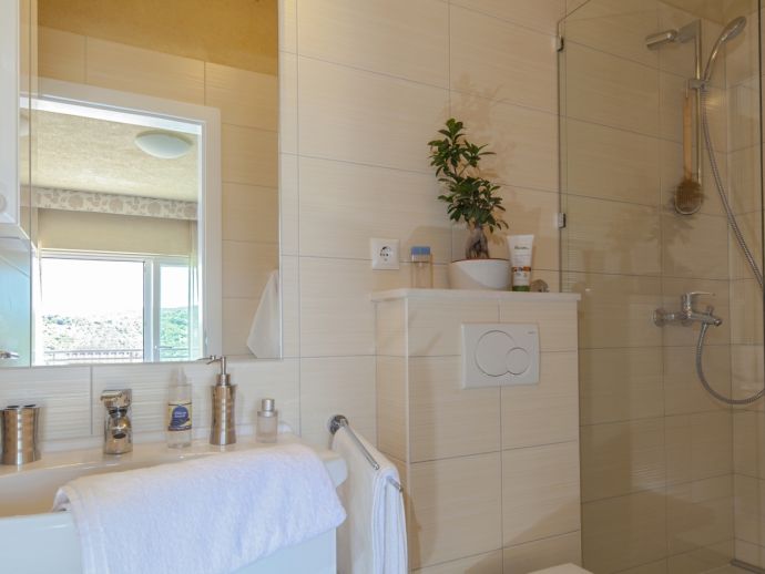 Bedroom 2: Double bed, A/C, TV and en-suite bathroom with shower.