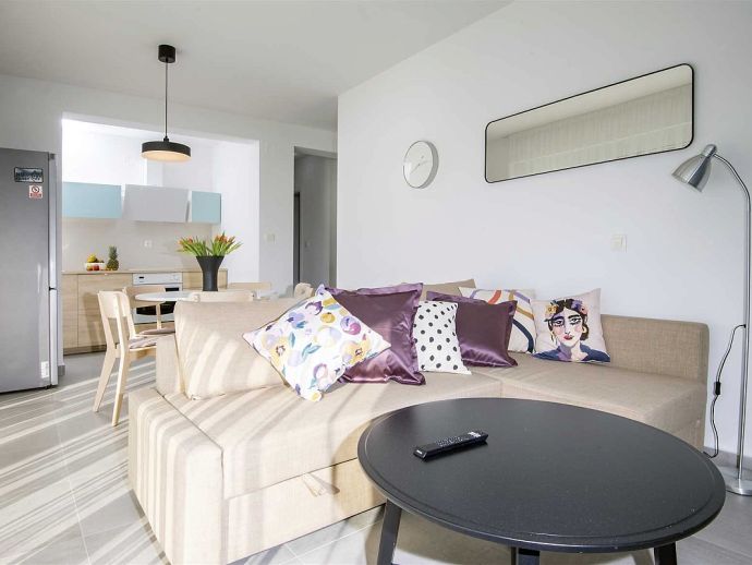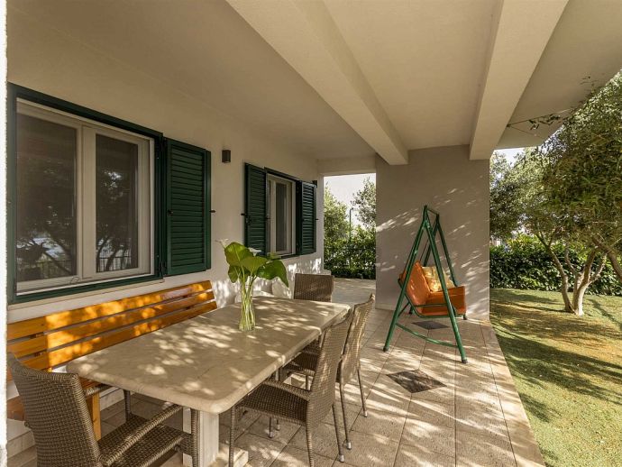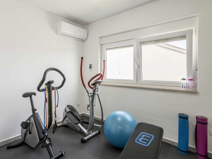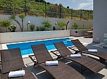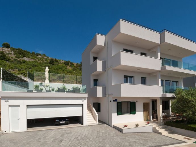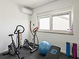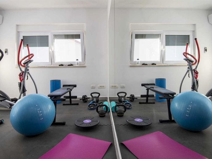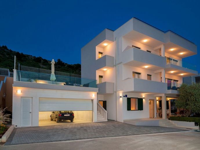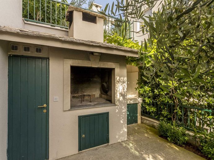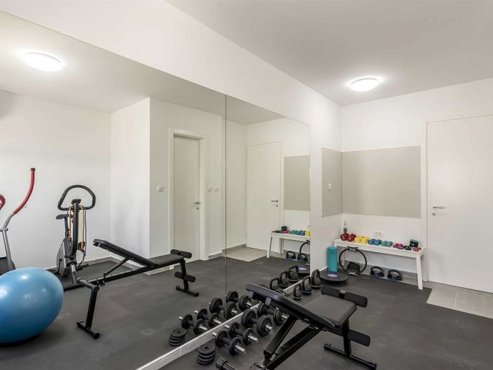 The villa itself consists of two separate apartments (1st floor and 2nd floor). On the first floor there are three bedrooms, two bathrooms, living room and kitchen, while outside on the terrace is the pool and sun loungers next to it. On the second floor there are two bedrooms, three bathrooms, gym, living room and kitchen and a balcony-terrace. Next to the garden on the ground level is a special area for barbecue, a large terrace where there is a large stone table and wooden benches and chairs for seating. On the ground level is also a garage for two cars and parking space for up to 3 cars.