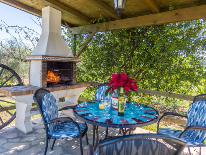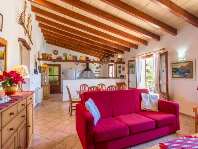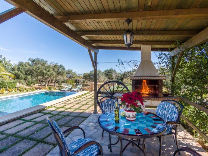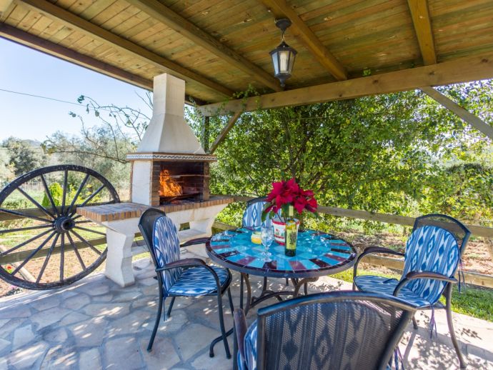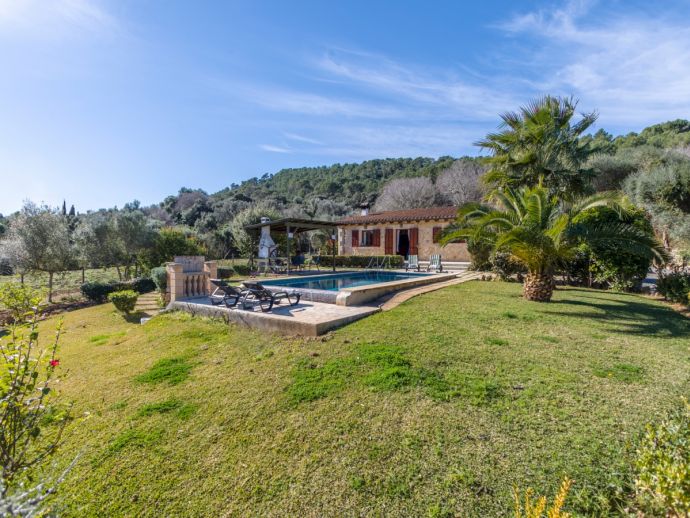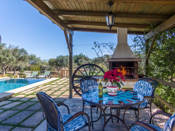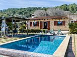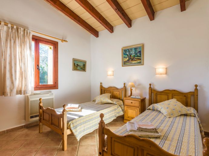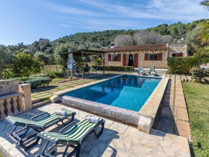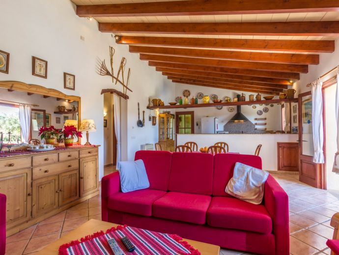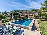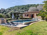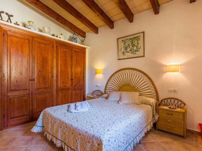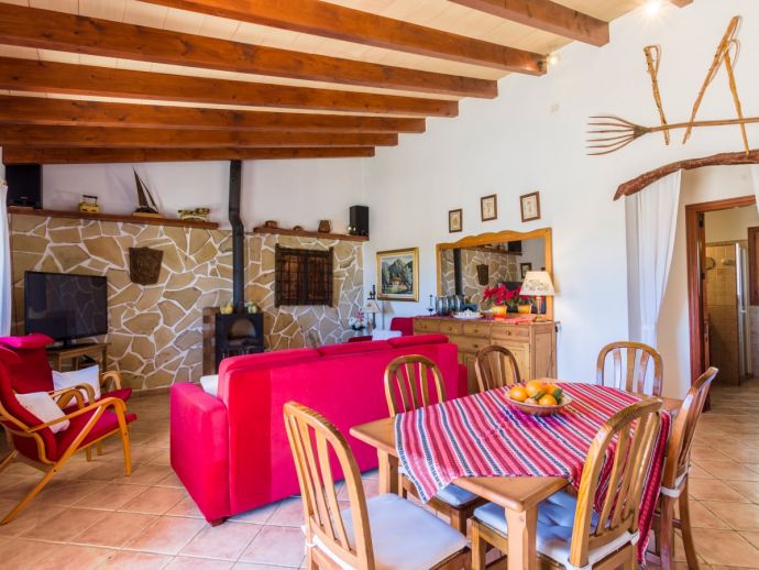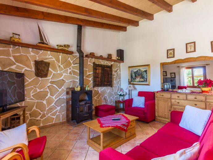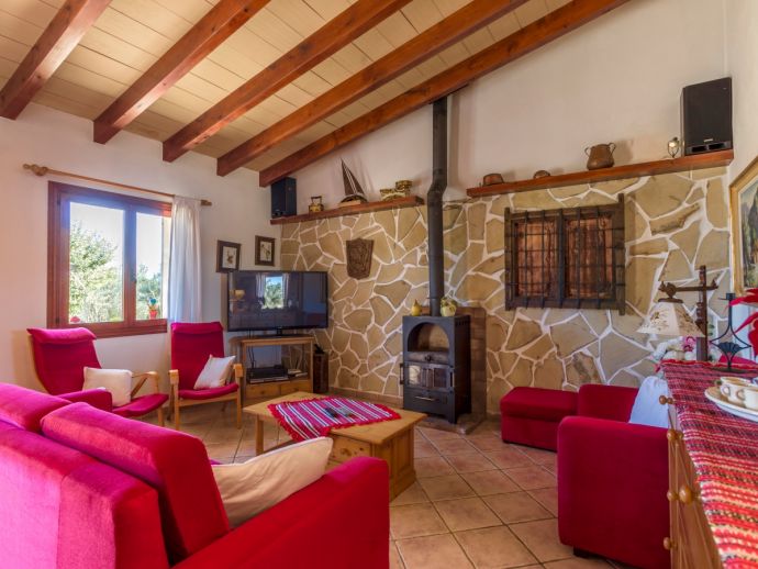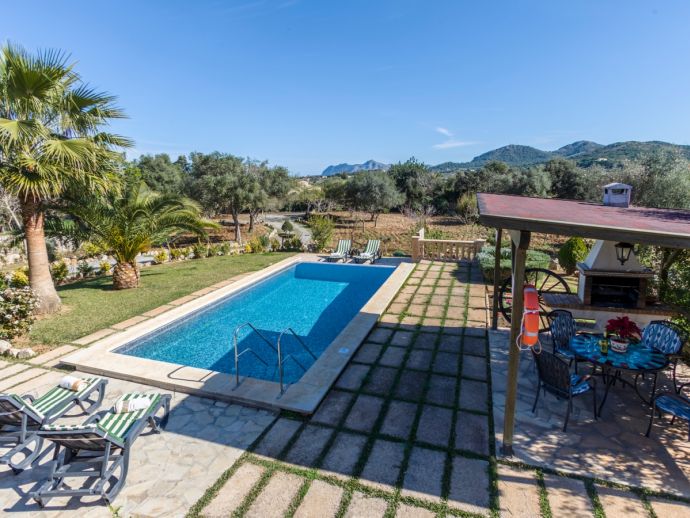 Finca Lucia is situated peacefully in a pine wooded area and within easy access of Pollensa and Alcudia at 5 km. This quaint one storey villa offers stunning countryside and mountain views in a secluded and private location and sleeps 4 people in 2 air-conditioned double bedrooms (1 double / 1 twin) with a shared bathroom. The sleeping areas are separated by archways leading to the open plan living space with a fully equipped kitchen, utility room, dining and living area with wood-burning fireplace comfortable seating, SAT TV (German, Spanish, English) and DVD player, WiFi is also available throughout the property. The villa is south facing and benefits from all day sunshine to enjoy the private pool and relaxation, there is also a covered terrace to provide shade and a brick-built barbecue for enjoying evening meals al fresco and a glass of the local wine as the sun sets in the distance.