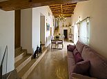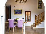 Living room, sofa with satellite TV and dining table for 8 people, from here you can access all bedrooms, two of them upstairs, both with en-suite bathroom, one with shower and one with hydro massage bathtub and shower. The ground floor features another bathroom with shower and two more double bedrooms. Each bedroom has air conditioning and satellite TV (languages: Spanish, English, German, French).
