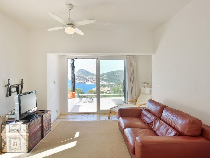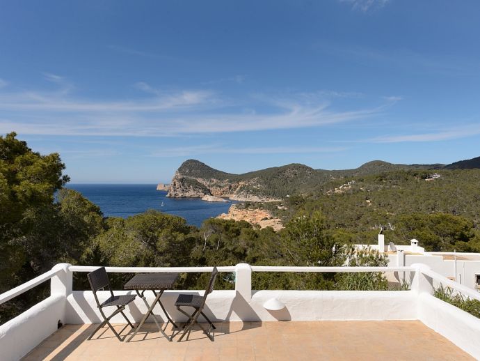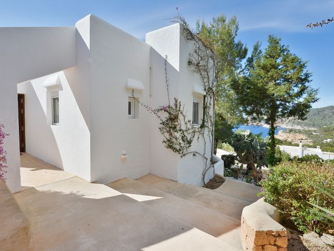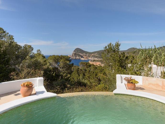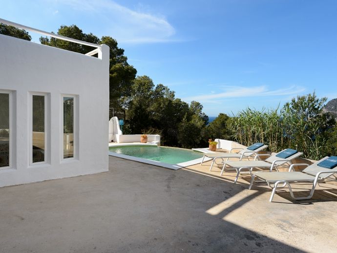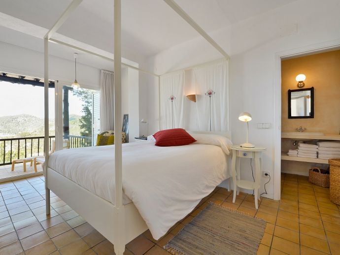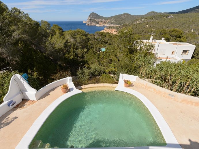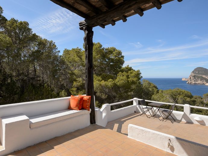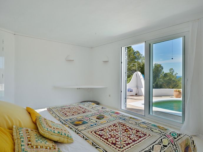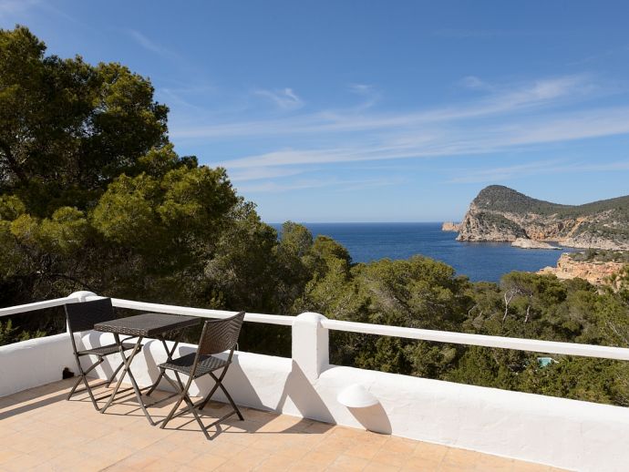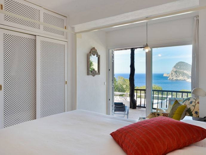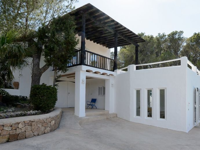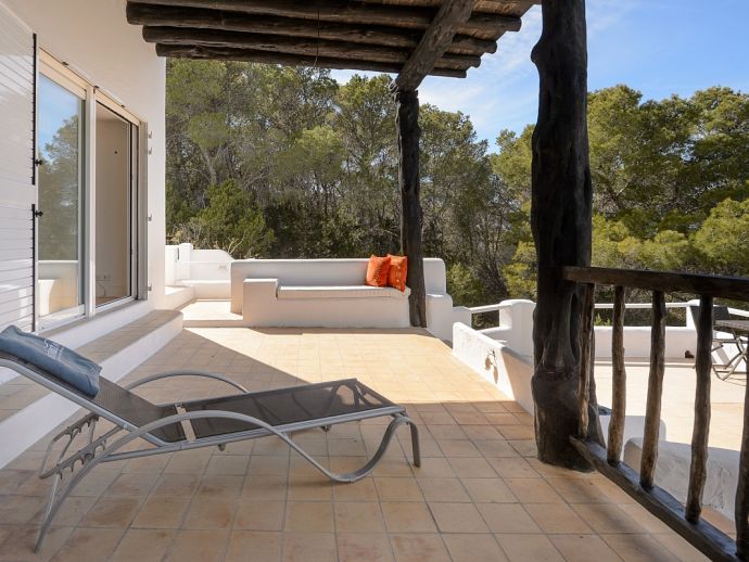 This charming house is located on the west end of the island, with views to Punta Galera and the sea, it also has a path leading to a little rocky beach (just a 5 minute walk and only for the use of the few neighbours who are in the area). You will reach the villa via a climbing and winding earth road (1.7 km), but once there it is very rewarding as you will be greeted by a delightful property with the most amazing views. It sits on a 16,000 m² plot with a fenced garden, private swimming pool and various relaxation areas, two small hidden terraces, an area of fruit trees with oranges and mandarins, a forest area on the south side and a small Japanese garden on the north side with cactus and olive trees. The villa is distributed over two floors and has 3 bedrooms with en-suite bathrooms and sleeps 6 + 2 (the bedroom with 2 single beds have pull out beds underneath them so a maximum of 8 is possible). The interior of the villa also includes a modern fully equipped kitchen, dining and living area with fireplace which are flooded with natural light from the large glass windows and doors and it's very favourable sea view position.