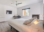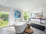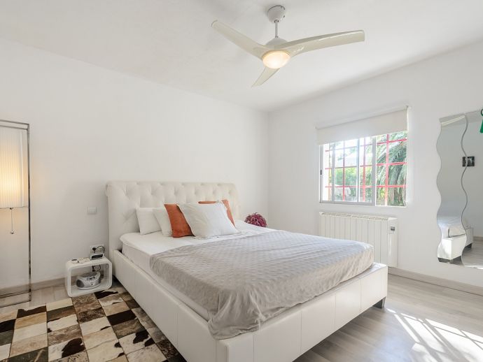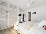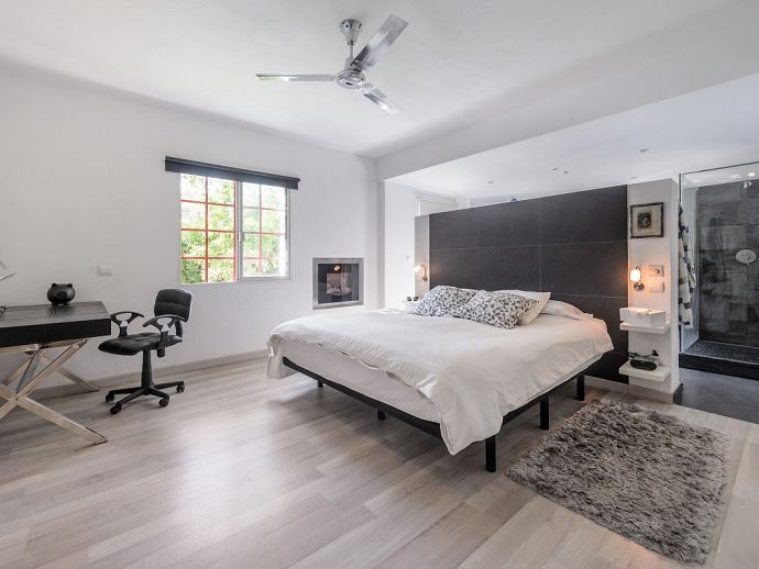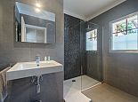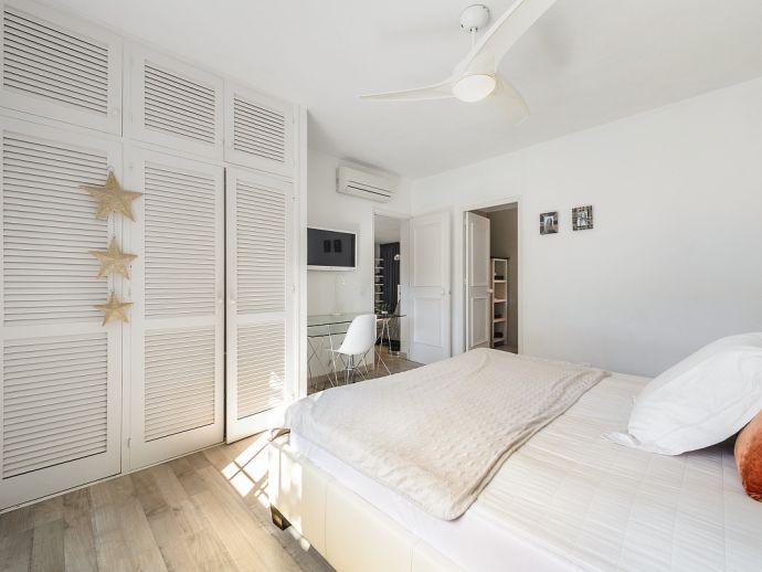 Master suite with double bed of 2x1.80m with open bathroom en suite (bath, shower, WC), ceiling fan and air conditioning.