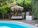 Fenced garden with barbecue, a 7x3m private swimming pool (maximum depth 1.50m), comfortable sun loungers and a Balinese bed.