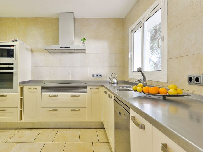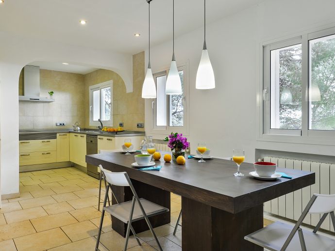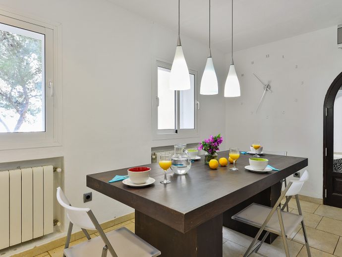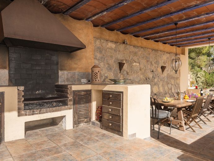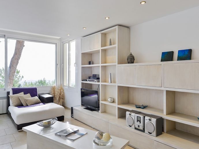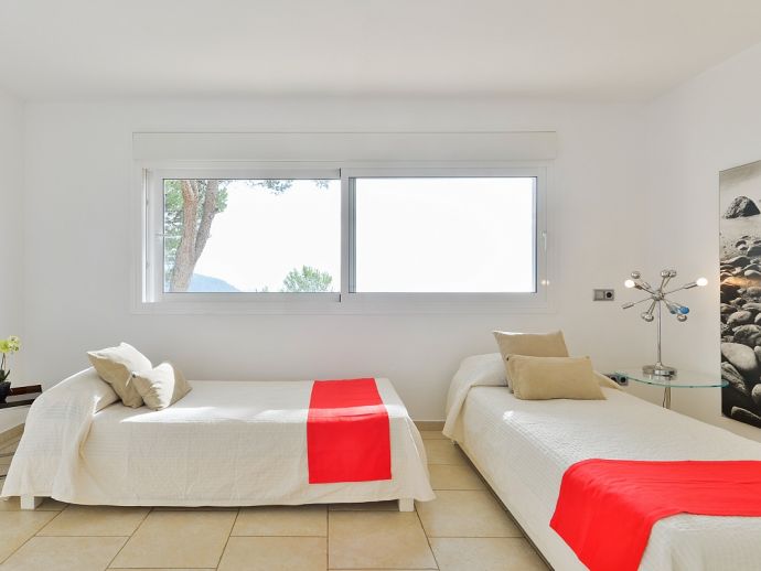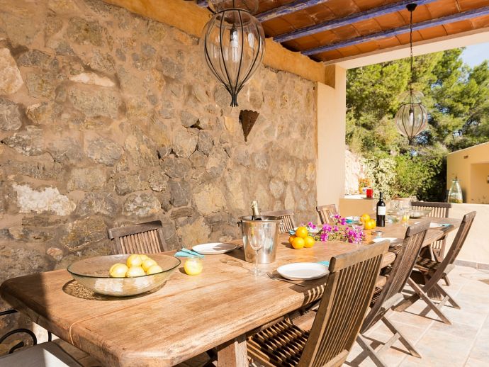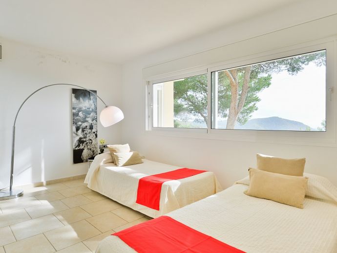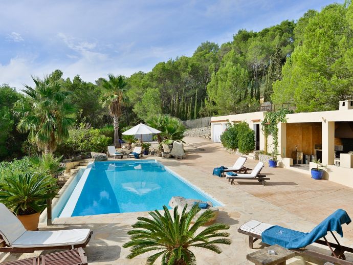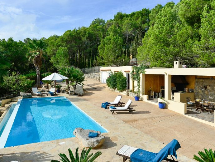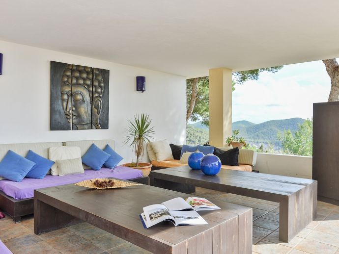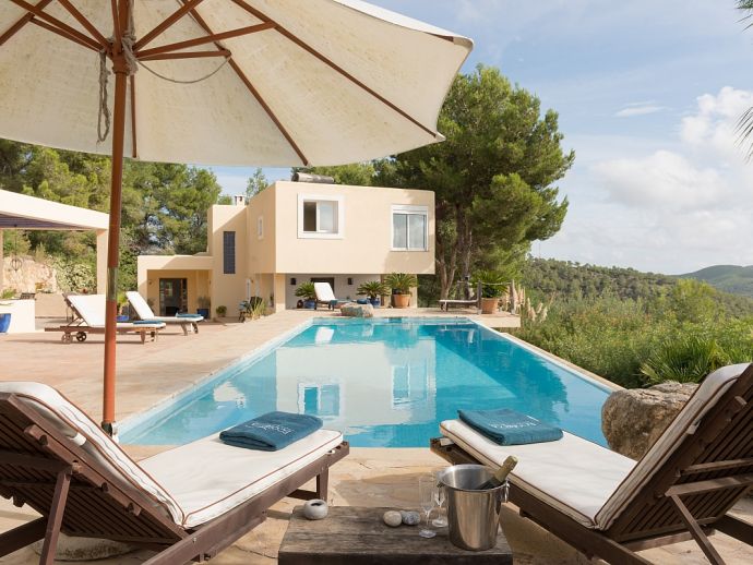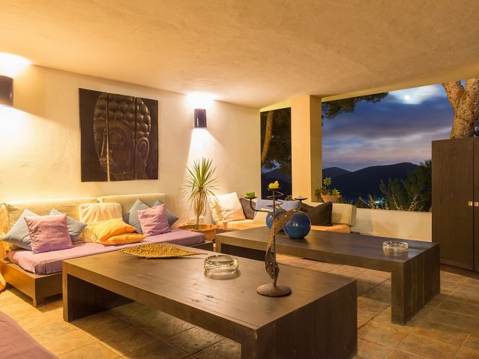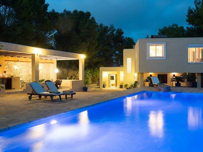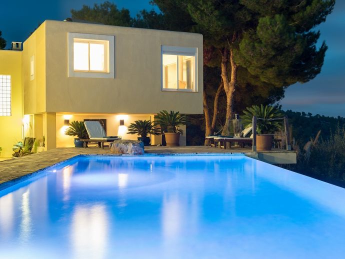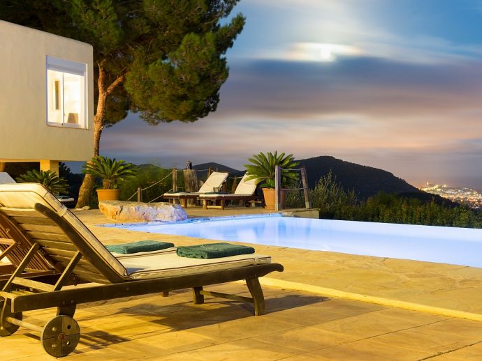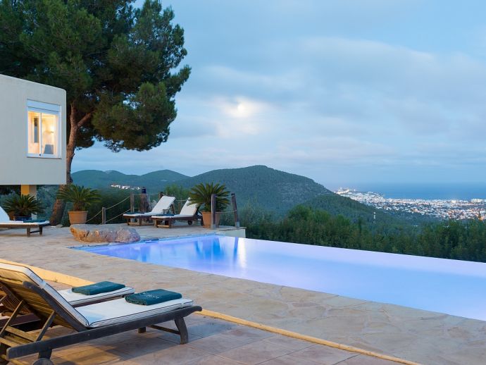 Aurora is a modern and stylish villa that sits on top of a hill and offers spectacular views to the Dalt Vila and Formentera. The interior has bright and spacious living areas and a fully equipped kitchen, there are 3 bedrooms and bathrooms in the main building and 1 bedroom and bathroom in a separate annex. Surrounded by countryside it sits on a gated plot of 2000 m² with private infinity swimming pool, large terrace, barbecue house with dining furniture and a covered chill out area. The villa sleeps 8 people in a beautifully furnished, air conditioned and comfortable environment and manages to show off the amazing panoramic views to the very best advantage.