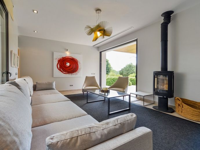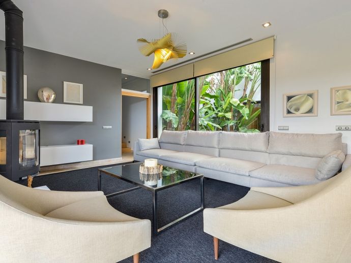 A "Zen" patio with plants surrounded by large windows and a guest toilet. Living room equipped with satellite TV (Spanish, German, English, French, Dutch) and a fully equipped kitchen with pantry both with access to the covered terrace, areas and pool. A second living room with fireplace, perfect for reading.