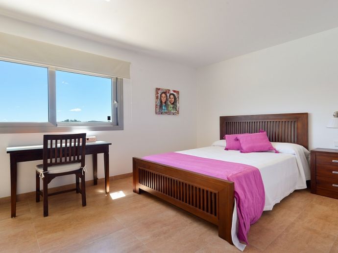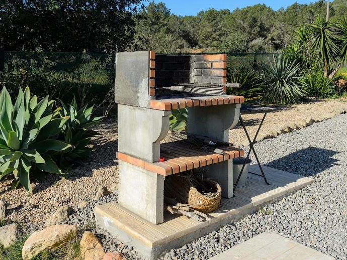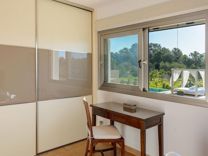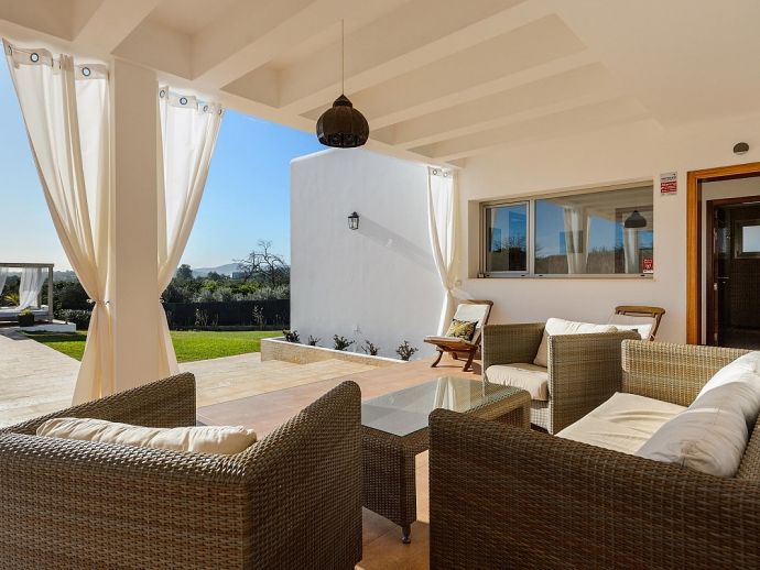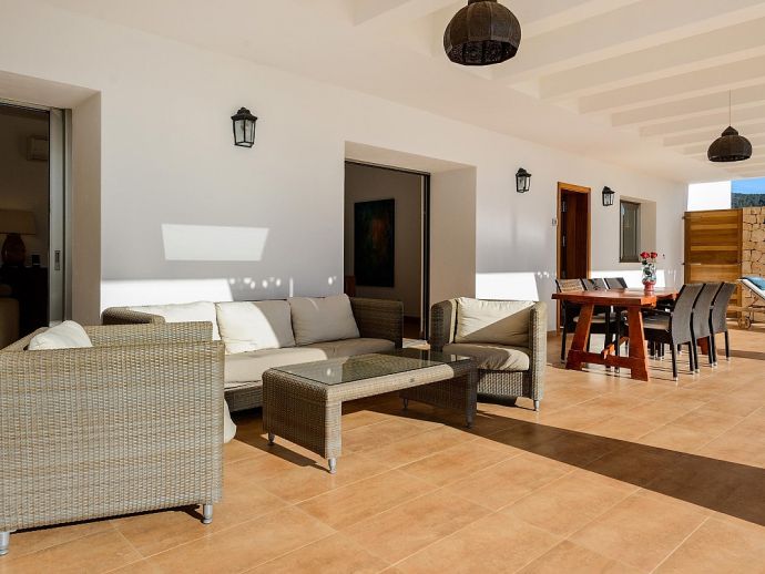 Oksana villa is a beautiful newly built house located between Santa Gertrudis and San Mateo, offering peace and quiet whilst still being close to the busier resorts. The villa is fully air conditioned, it has been tastefully decorated and furnished throughout and comfortably sleeps 6 persons. Distributed over one floor, there are 3 double bedrooms, the master features an en-suite bathroom plus a second shared bathroom, a modern fully equipped kitchen, laundry/storage room and a spacious living and dining area with feature fireplace which opens out to a lovely covered terrace. The terrace has furniture for dining al fresco and for relaxation and overlooks the private saltwater pool and garden with fruit trees.