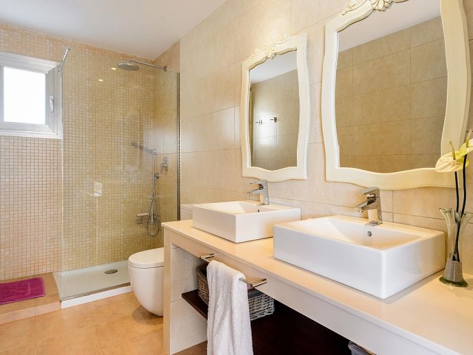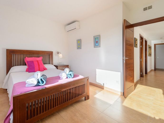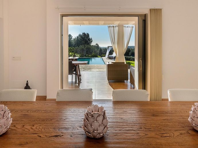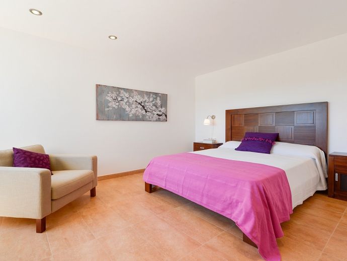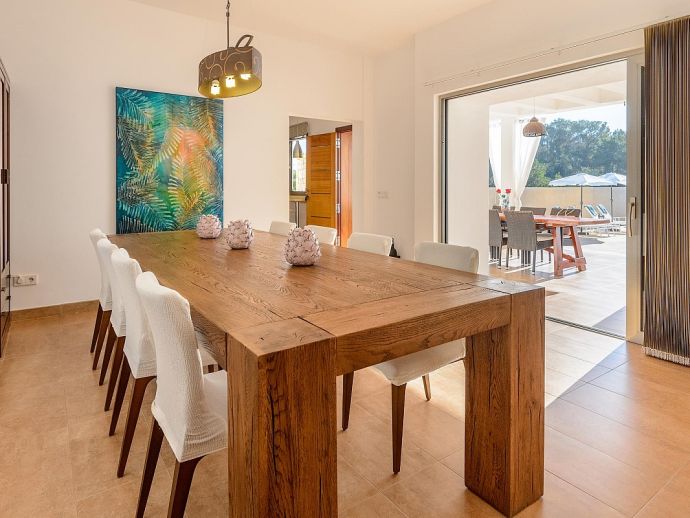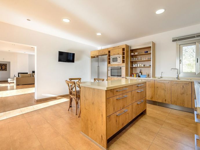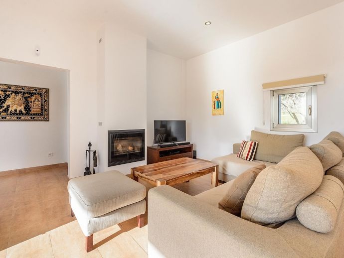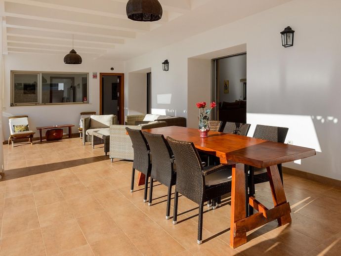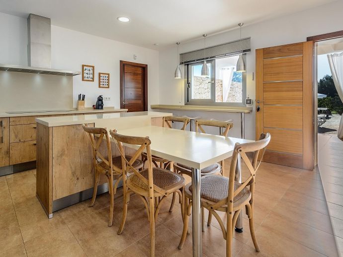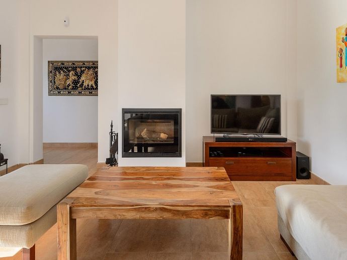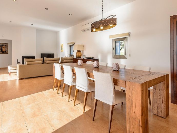 Dining room with table for 6-8 guests, satellite TV (Spanish, English, German, Dutch, French), fireplace, large windows leading to the terrace in front of the house and pool. Fully equipped kitchen with laundry and storage room (with separate entrance). 3 double bedrooms and 2 bathrooms.