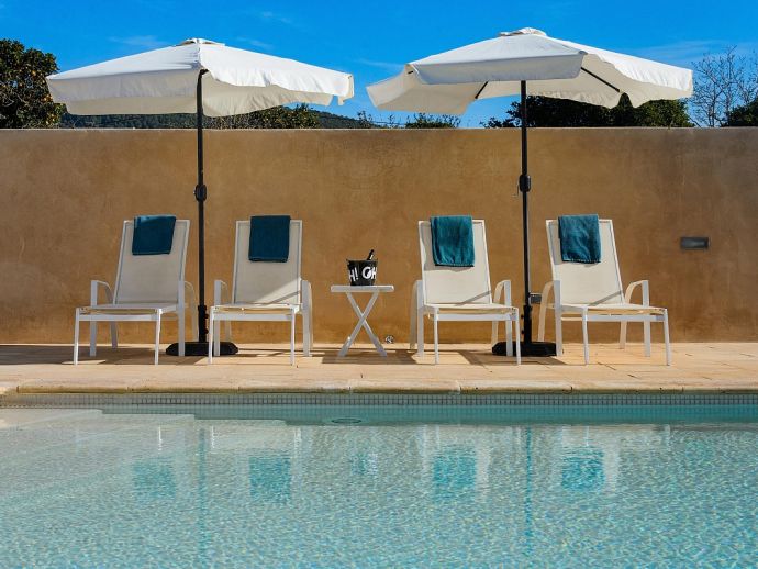 Private Saltwater Pool (12 x 4.5 - max depth 5.9 ft, min. depth 2 ft) surrounded by lawn and fruit trees. 6 sunbeds, ping-pong table, barbecue, a large terrace with al fresco dining and sofa area protected by diaphanous curtains and a Balinese bed.