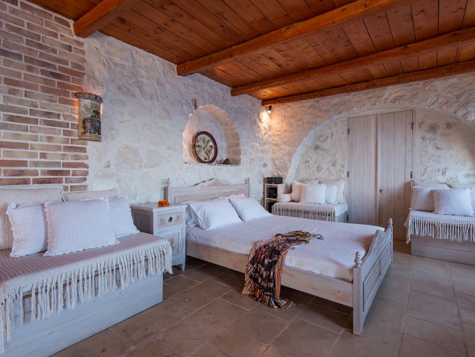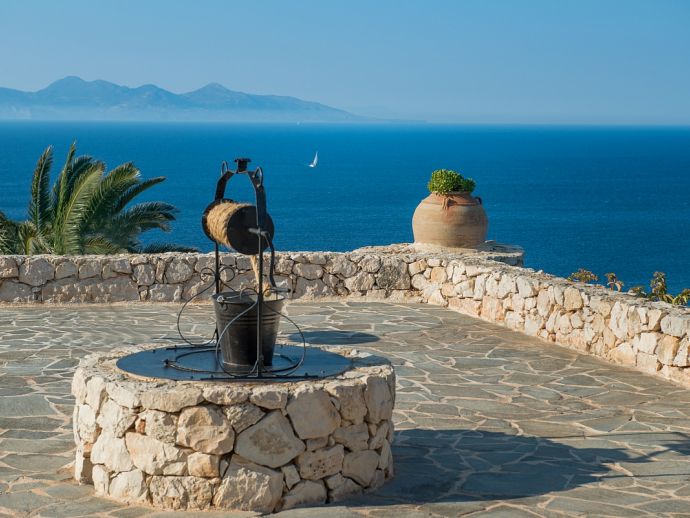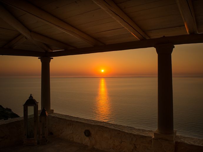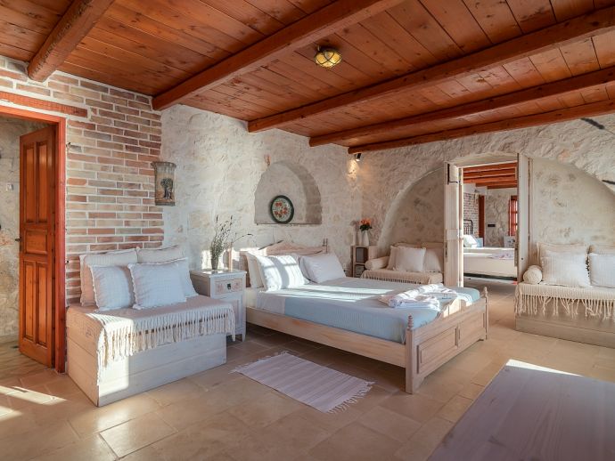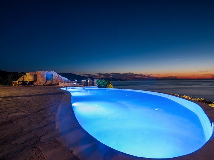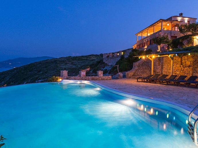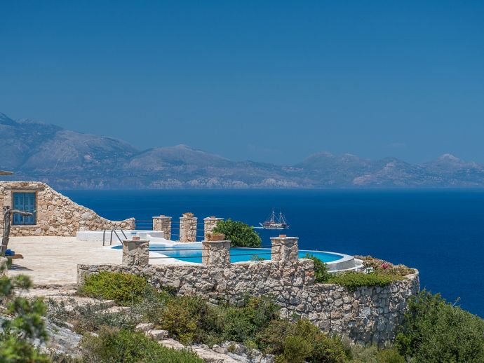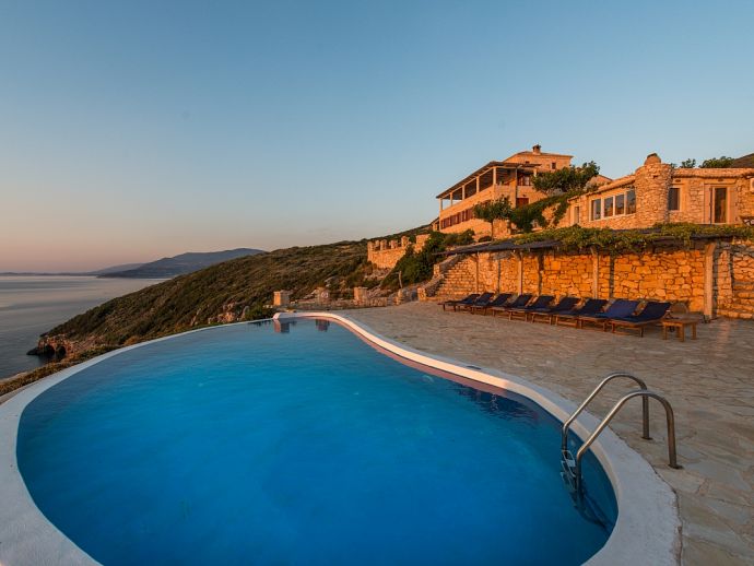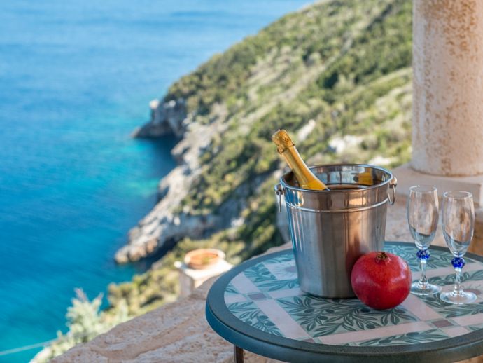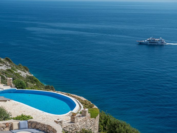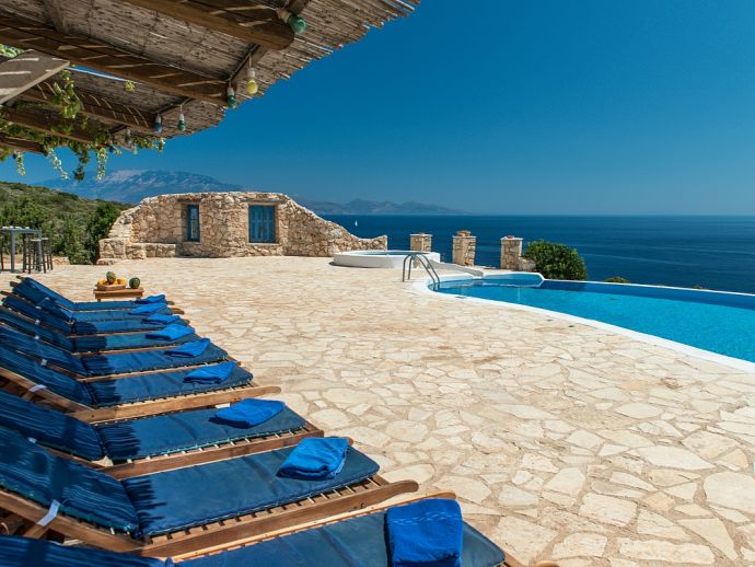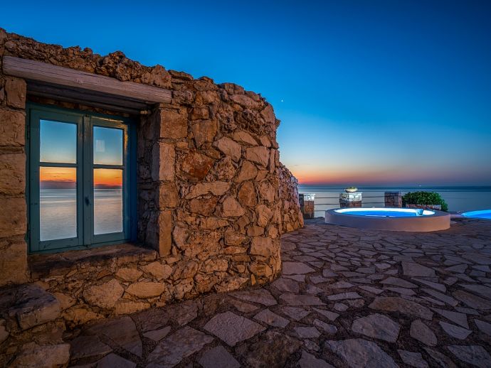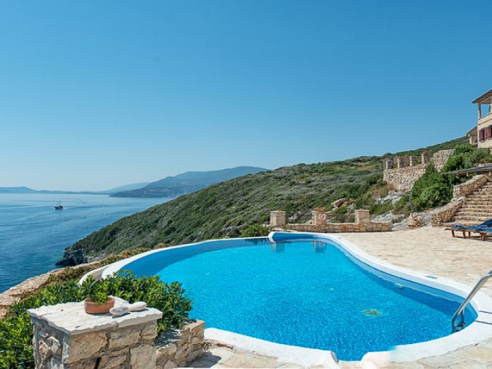 The Deep Blue Villa is situated in a private, peaceful and romantic villa complex comprised of six traditional Zakynthian luxury stone houses in full harmony with the environment. It stands majestically on the cliff and offers breathtaking panoramic views. The villa was built according to the architectural Zakynthian tradition with natural stone and is beautifully decorated. It has 4 spacious en-suite bedrooms, a private infinity pool with hydro-massage area and also has direct access to the sea via a stone path which leads down to the impressive Priest's Cave.