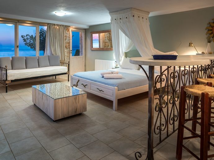 A private, self-contained, comfortable 60sqm Guesthouse overlooking the sea, the pool and Kefalonia with a capacity for 2-3 people. It features its own entrance, open plan kitchen and large bathroom, while it's fully equipped with home appliances, TV, Hi-Fi and it is also air-conditioned.