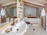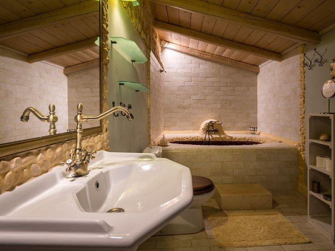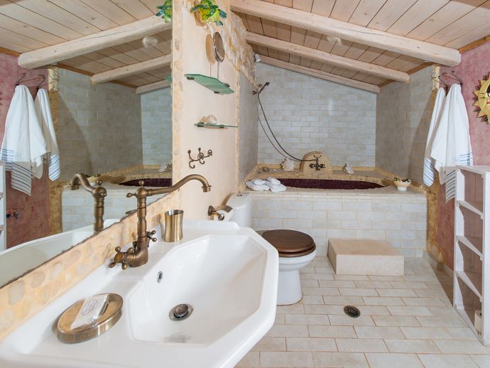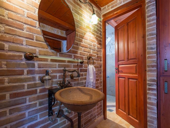 • Fully equipped galley kitchen with dining table (gas stove and oven, fridge/freezer, kettle, microwave, toaster, juicer, blender, filter coffee machine, dishwasher, washing machine) • Comfortable sitting/dining room with traditional stone fireplace, Satellite TV (LCD/LED TV’s), CD-DVD player, Hi-Fi • 3 air-conditioned bedrooms with en-suite bathrooms • Private, self-contained guesthouse with it's own entrance, open plan kitchen, double bedroom, extra single bed and large bathroom, fully equipped with home appliances, TV, Hi-Fi and air-conditioning •