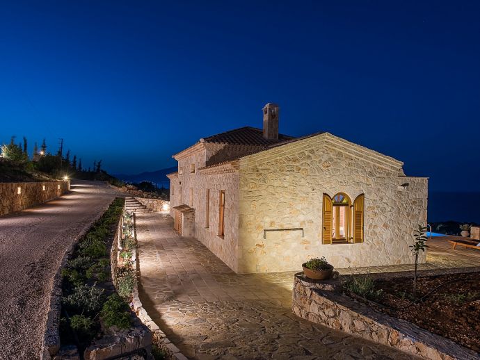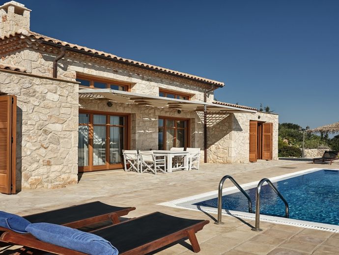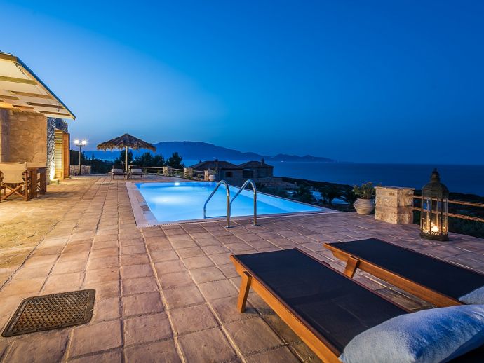 Fantasia Villa is a single storey accessible villa with 2 en-suite bedrooms for 4 persons, it is situated in a private, peaceful and romantic villa complex comprised of six traditional Zakynthian luxury stone houses, built in full harmony with the environment.The villa is tastefully designed and offers panoramic views overlooking the vineyard the sea and beyond. It features its own private infinity pool with hydro-massage and has direct access to the sea via a stone path which leads down to the impressive Priest's Cave.