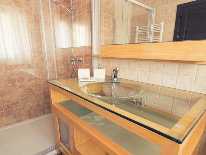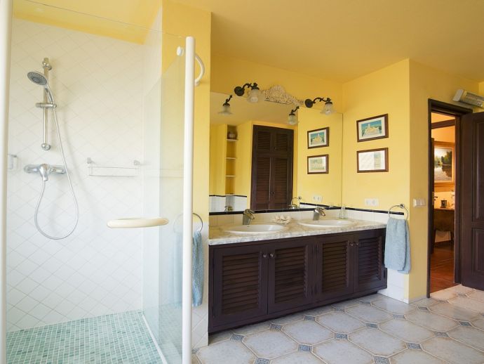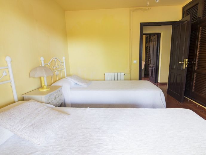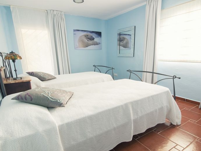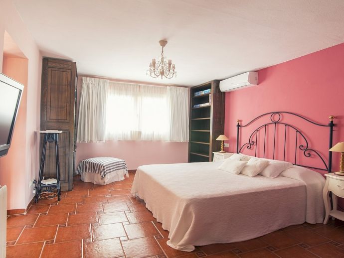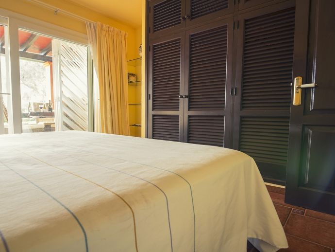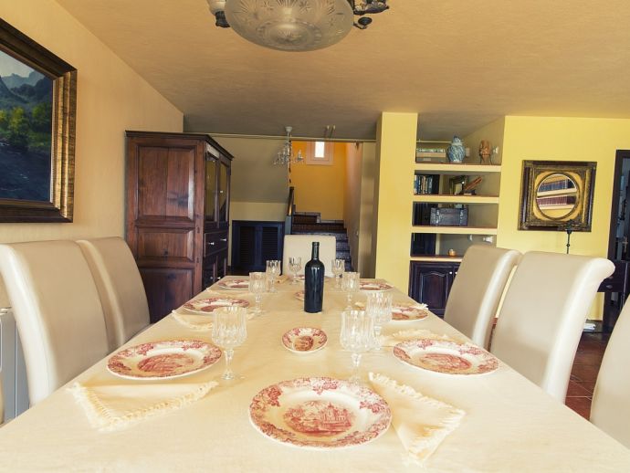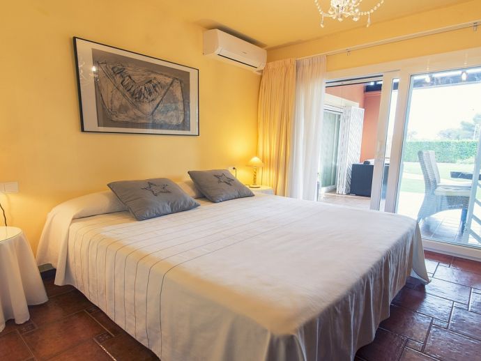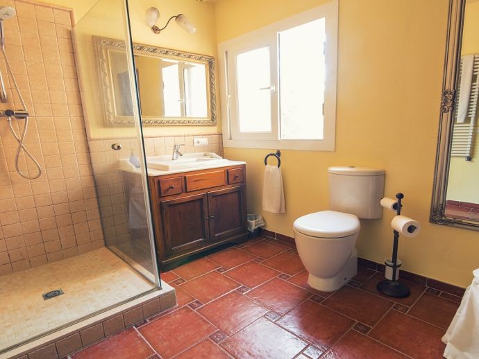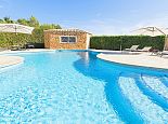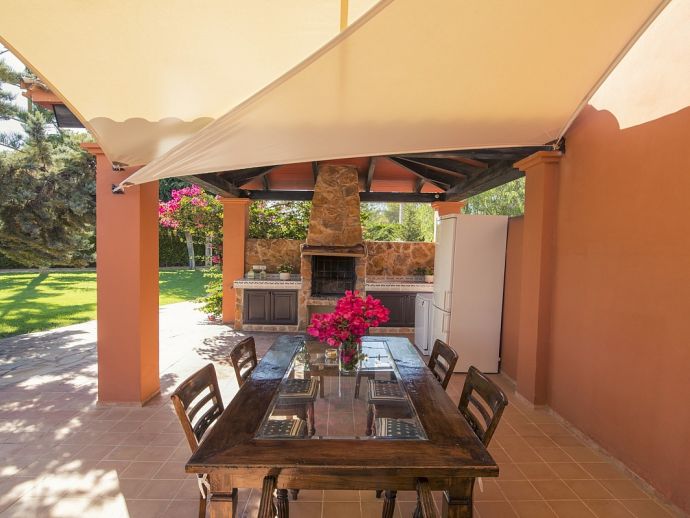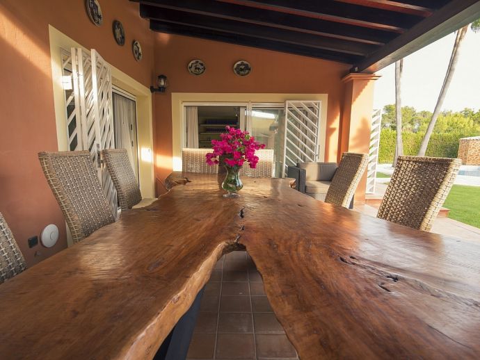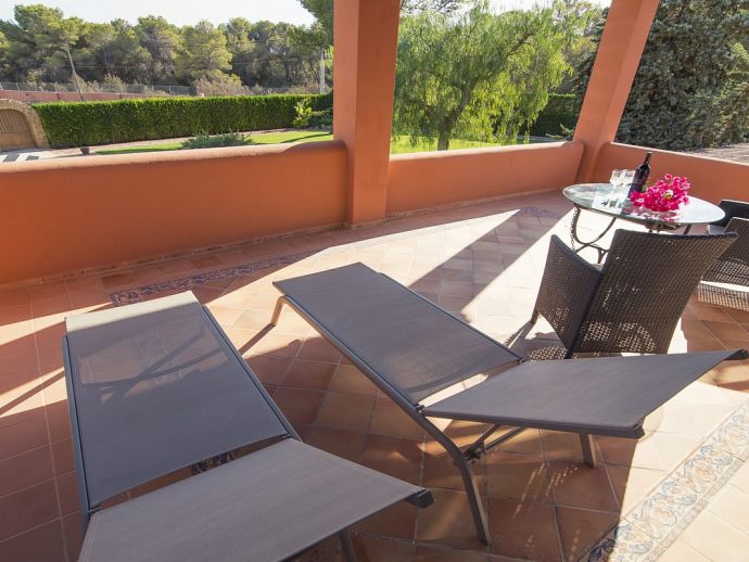 Villa Clarissa is located just 700 meters from the picturesque beach at Es Torrent, it is a large house with 5 bedrooms that comfortably sleeps 10 and sits on a generous garden plot of 3,000 m² with a private swimming pool, a gym and surrounded by hedges that provides total privacy. On the main floor of the house there are 4 bedrooms, one double bedroom with en suite shower, a second double bedroom, two twin bedrooms, a shared bathroom with shower and a guest toilet. There is a fully equipped kitchen, a living room with leather sofas, satellite TV, stereo, DVD and dining room which leads out to the barbecue area and covered porch with a wooden table for 10 people. On the upper floor there is a large master suite with a double bed and big bathroom, this room opens onto a private terrace with furniture and views to the garden and pool. Clarissa has air conditioning, WiFi (available in all bedrooms), 3 TV's and offers very spacious accommodation making it ideal for either large families or groups of friends.