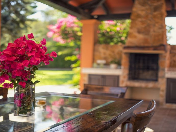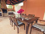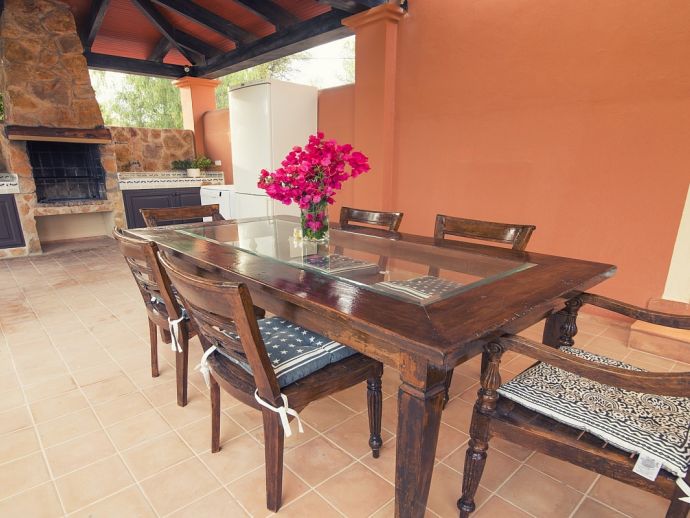 Outside barbecue area, a covered terrace with a large wooden table for 10 people, a second rustic table and a refrigerator.