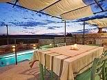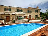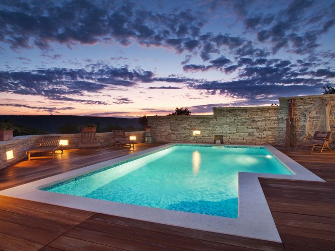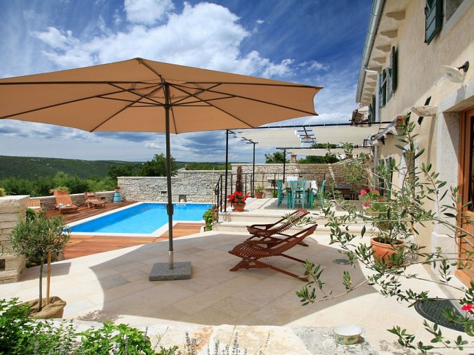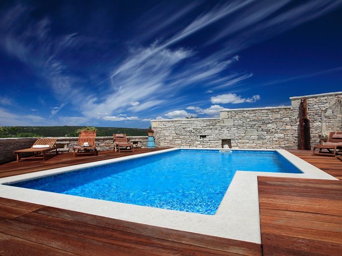 Villa Sanja is a traditional stone villa located on the hill in a beautiful setting with views to the sea and just 900 meters from the beach and Trget bay. Its traditional style with reclaimed stone and oak beams used for the construction give it a very special atmosphere, a mixture of tradition, comfort and luxury. The villa is distributed over 2 floors and sleeps 6 people, there are 3 double bedrooms with air conditioning, (one with en-suite) and a large family bathroom with a Jacuzzi bath on the first floor. On the ground floor there is another bathroom with a shower, a utility area, a living room with a wood-burning fireplace and a large fully equipped kitchen and dining area. Overlooking the private swimming pool which is surrounded by a pretty decked area is a covered pergola with dining furniture to enjoy meals al fresco whilst enjoying the sea views and relaxing atmosphere.