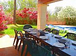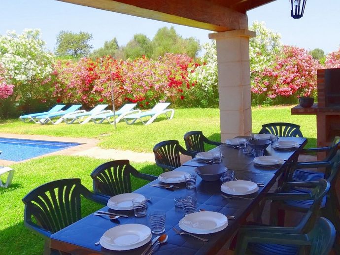 Covered terrace, dining furniture and barbecue.