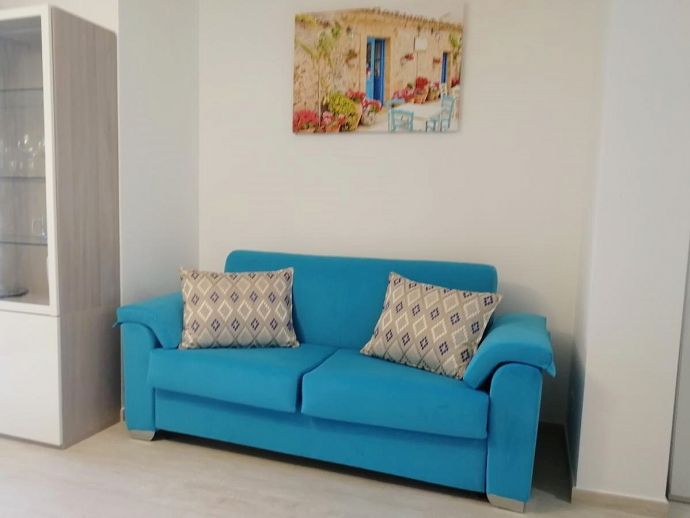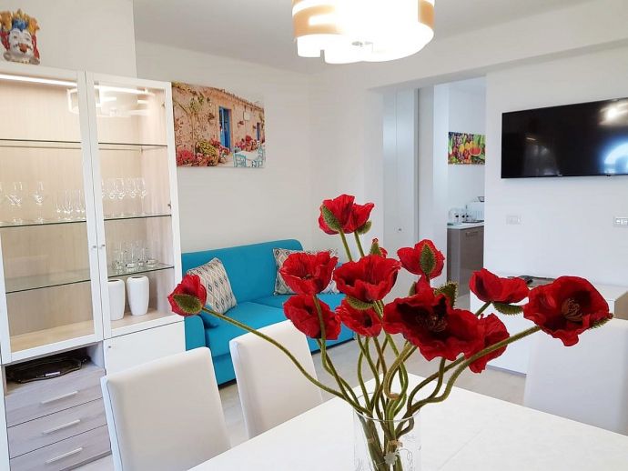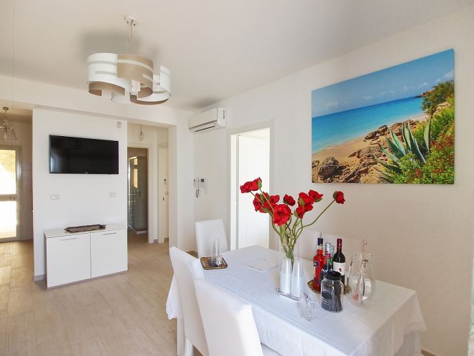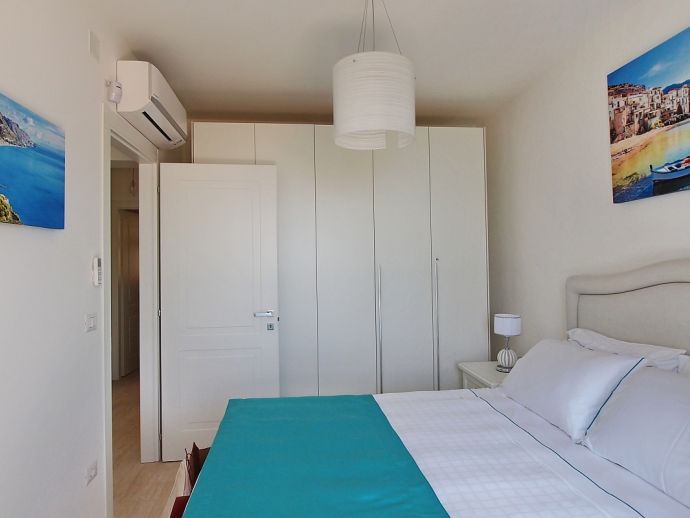 The apartment has a private terrace and garden overlooking the sea. It is composed of a living-dining room with a sofa bed for 1 extra person , fully equipped kitchen, two double bedrooms and a bathroom with shower, air conditioning, Wi-Fi and satellite TV.