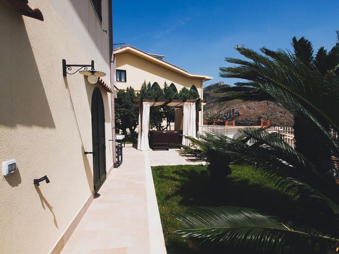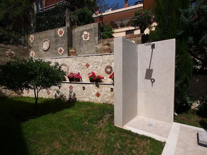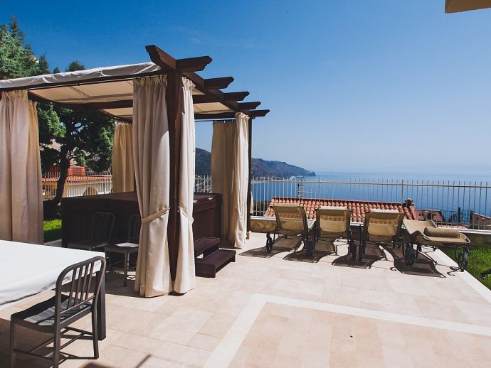 This beautiful apartment "Paolina" is located inside a villa with garden in a residential complex with sea view at 600 m from the well-known “Corso Umberto” in the charming heart of Taormina. The villa is divided in two modern apartments, named Angelina and Paolina. The view from both apartments is breath-taking, with a beautiful panorama of Letojanni and the Calabria coast. The apartments are located in a peaceful area very close to Taormina center and each apartment has its own external jacuzzi with gazebo and external shower, where you will have a chance to enjoy a glass of Sicilian wine on the beautiful terrace. Designed in a modern-style with love for details, the apartments have a high quality level regarding comfort.