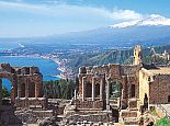 Taormina is a hilltop town on the east coast of Sicily also known from "The Godfather" movie scenes. It sits near Mount Etna, an active volcano with trails leading to the summit. The town is known for the Teatro Antico di Taormina, an ancient Greco-Roman theater still used today. Near the theater, cliffs drop to the sea forming coves with sandy beaches. A narrow stretch of sand connects to Isola Bella, a tiny island and nature reserve.