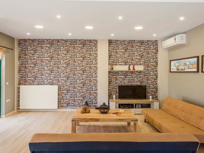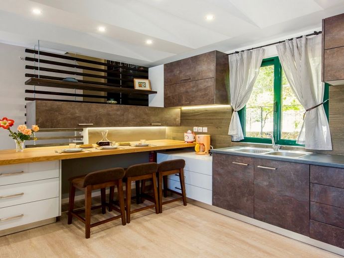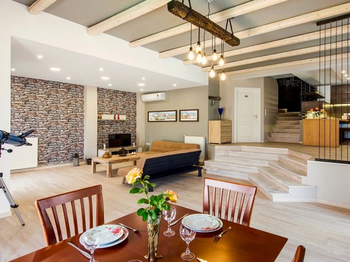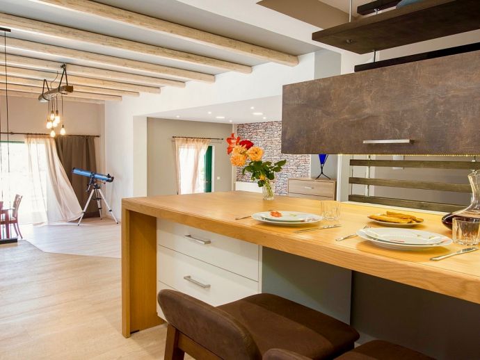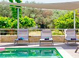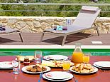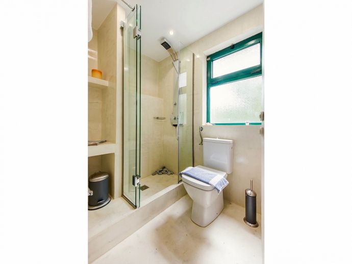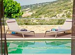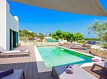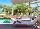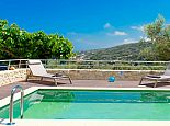 Distributed over 2 floors - The ground floor is split-level and consists of a beautifully designed kitchen (purposely built for Villa Elissa) with a breakfast bar and all the necessary appliances, a dining area overlooking the pool and a comfortable lounge area with satellite TV, sofas and a single sofa bed for the 7th guest. Also on this floor is a welcoming double bedroom and a family bathroom with shower. On the upper floor there are 2 further double bedrooms with TV's, en-suite shower rooms that have direct access to large panoramic terraces. For the comfort of the guests, the whole villa is air-conditioned both in the bedrooms and common areas.