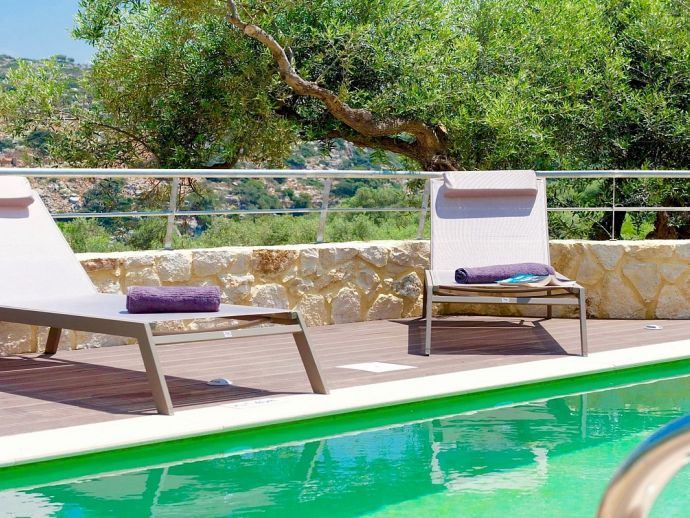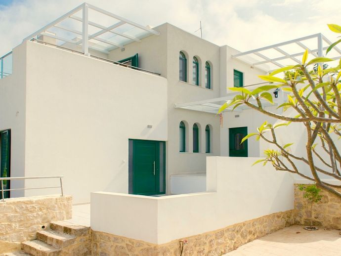 Attractive whitewashed villa with large terraces, arches and elements coming from the Cycladic tradition set in spacious grounds with pleasant views that stretch from the surrounding olive groves to the sea beyond.