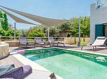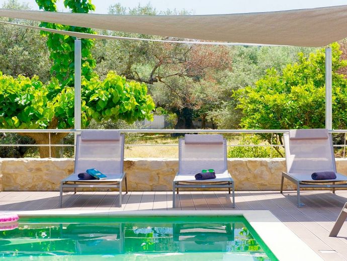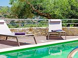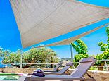Spacious patio with comfortable sunbeds, brick-built barbecue and dining area - for additional shade a canopy is available by the poolside.